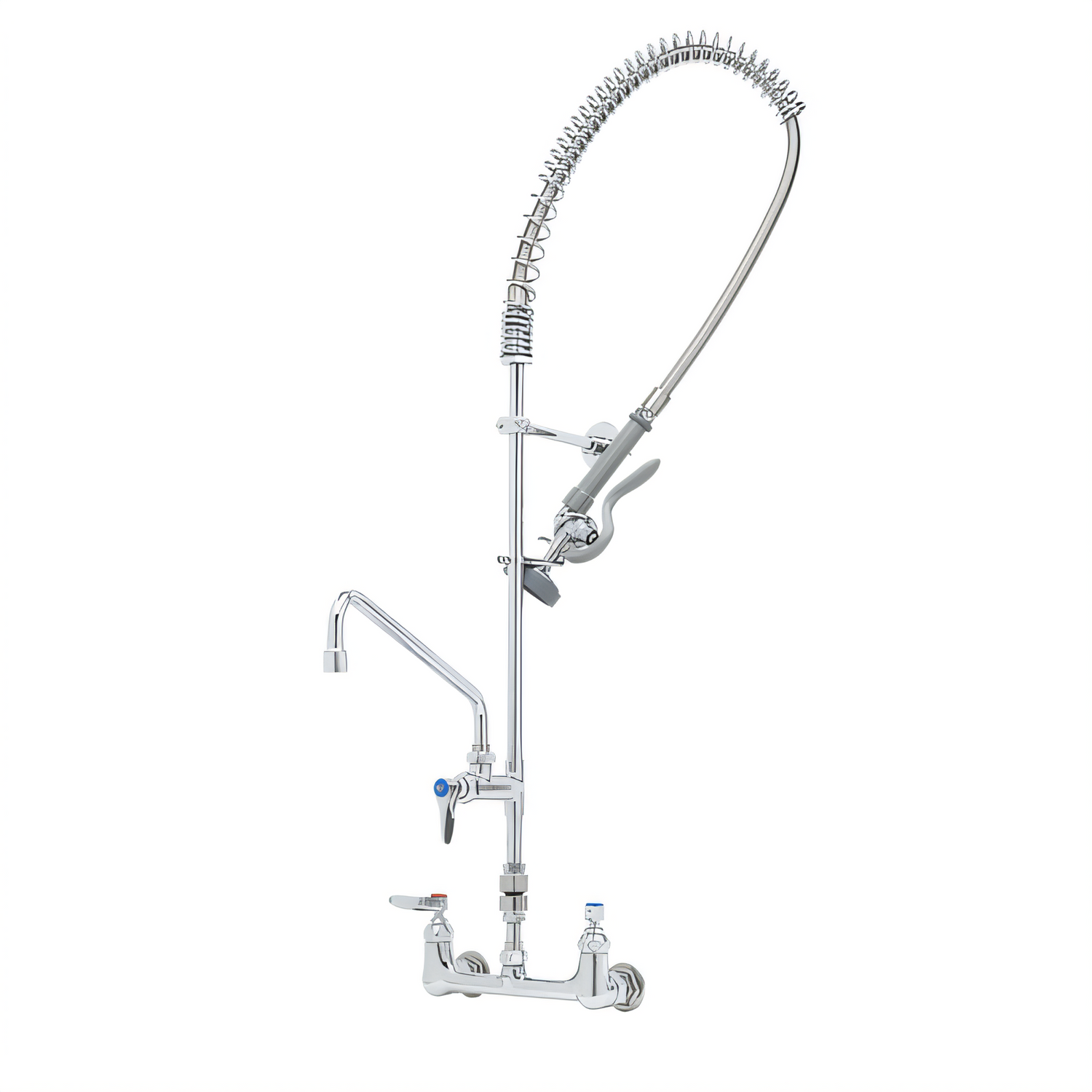 EasyInstall Pre-Rinse Unit, wall mount, 8" center, 12" swing spout add-on faucet, spring action gooseneck, 1.15 GPM spray valve (B-0107), 18" riser, 44" flexible stainless steel hose, vacuum breaker, 6" wall bracket, lever handles, quarter-turn Eterna cartridges, includes supply nipple kit (B-0425-M), low lead, 2019 DOE PRSV - Class II