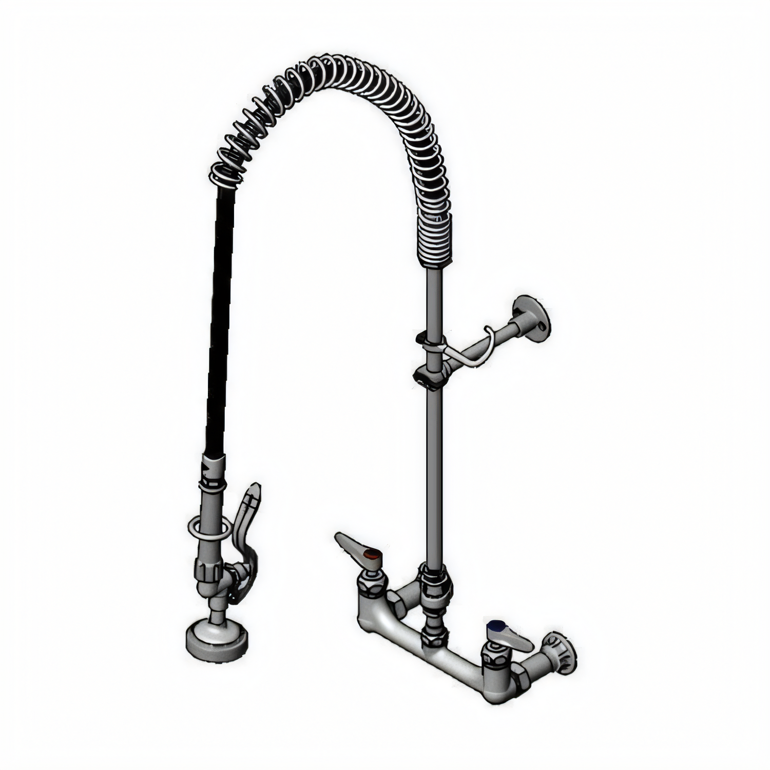 EasyInstall Pre-Rinse Unit, wall mount, 8" center, spring action gooseneck, 1.15 GPM spray valve (B-0107), 18" riser, 44" flexible stainless steel hose, vacuum breaker, 6" wall bracket, lever handles, quarter-turn Cerama cartridges, includes supply nipple kit (B-0425-M), low lead, 2019 DOE PRSV - Class II
