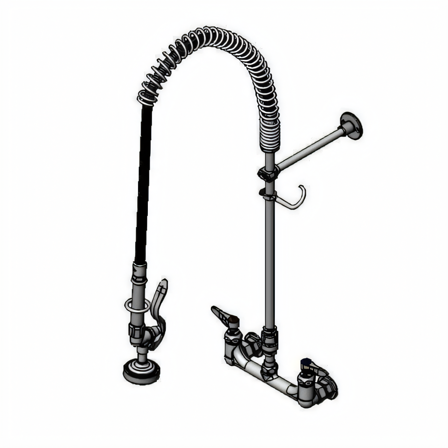 EasyInstall Pre-Rinse Unit, wall mount, 8" center, spring action gooseneck, 1.15 GPM spray valve (B-0107), 18" riser, 44" flexible stainless steel hose, vacuum breaker, 9" wall bracket, lever handles, quarter-turn Eterna cartridges with spring checks, includes supply nipple kit (B-0425-M), low lead, 2019 DOE PRSV - Class II