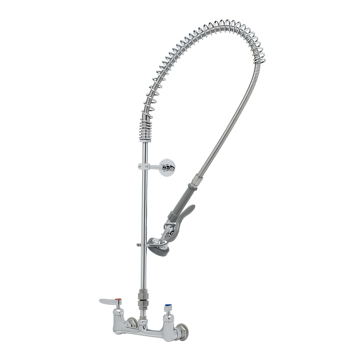 EasyInstall Pre-Rinse Unit, wall mount, 8" center, spring action gooseneck, 1.15 GPM spray valve (B-0107), 18" riser, 44" flexible stainless steel hose, vacuum breaker, 6" wall bracket, lever handles, quarter-turn Cerama cartridges, includes supply nipple kit (B-0425-M), low lead, 2019 DOE PRSV - Class II