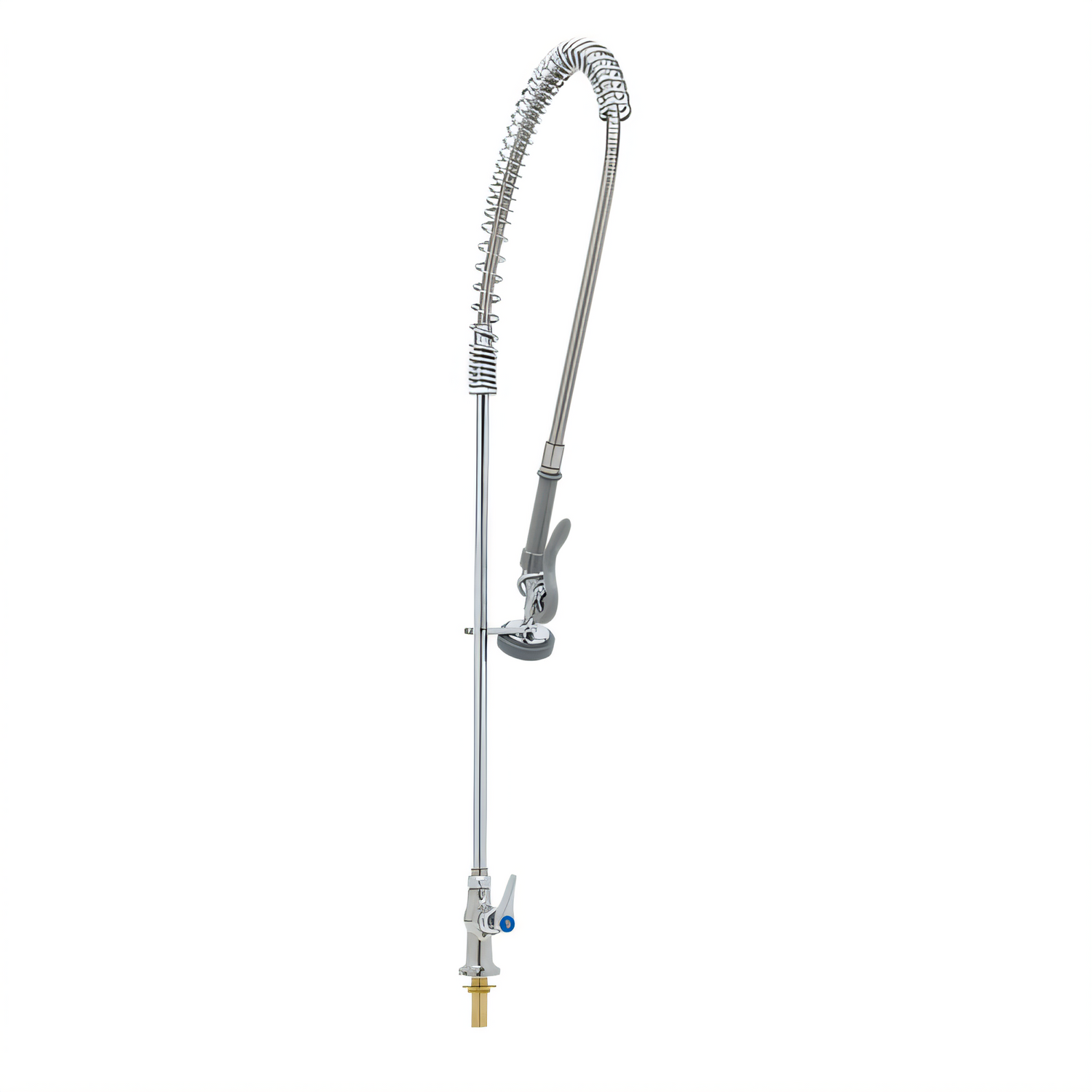T&S Brass B-2285-CR pre-rinse faucet: deck-mount, spring gooseneck, 1.15 GPM spray, 24" riser, durable stainless hose, lever handle, low-lead compliant.