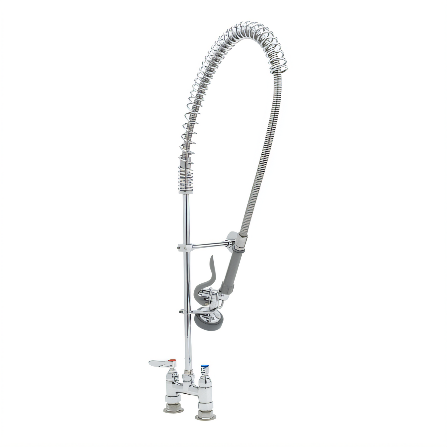 EasyInstall Pre-Rinse Unit, deck mount base, 4" center, spring action gooseneck, 1.15 GPM spray valve (B-0107), 24" riser, 44" flexible stainless steel hose,6" wall bracket, 1/2" NPT female inlets, lever handles, quarter-turn Eterna cartridges, low lead, 2019 DOE PRSV - Class II