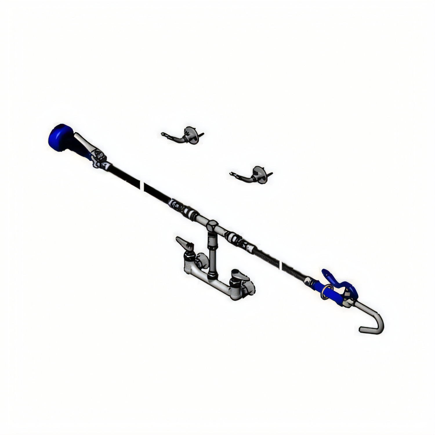 EasyInstall Kettle Kaddy Pot Filler Faucet, wall mount mixing faucet with 8" centers, quarter-turn Eterna cartridges with spring checks, lever handles with color-coded indexes, (2) vacuum breakers (B-0970-FE), swivel tee wtih 5" EasyInstall riser, (2) 144" flexible stainless steel hoses with blue heat-resistant handles & pull down rings, (1) high flow spray valve (EB-0108-H), (1) hook nozzle, (2) wall hooks with mounting screws, chrome-plated brass faucet body, 1/2" NPT female inlets, low lead, cCSAus