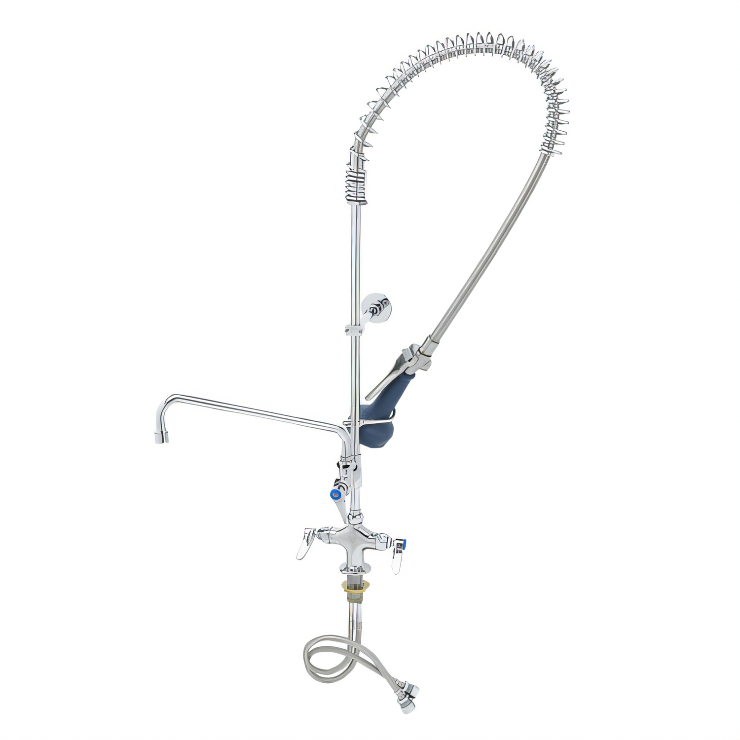 Pre-Rinse Unit, deck mount, single hole mixing faucet, spring action gooseneck, low flow 0.65 GPM spray valve (B-0108-C), 12" swing spout add-on faucet, 18" riser, 44" flexible stainless steel hose, 6" wall bracket, 1/2" NPSM male inlets, lever handles, quarter-turn Eterna cartridges, low lead, 2019 DOE PRSV - Class II