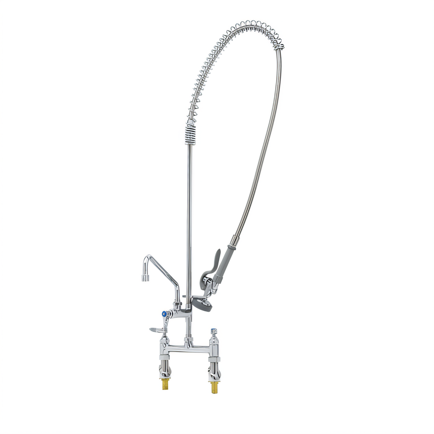EasyInstall Pre-Rinse Unit, spring action gooseneck, 8" deck mount mixing faucet & add-on faucet, 12" swing nozzle, lever handles with color coded indexes, 22" riser, spray valve (B-0107), 54" flexible stainless steel hose,1.07 GPM insulated grip blue sprayer, quarter-turn Eterna cartridges with spring checks, polished chrome-plated brass faucet body, 1/2"NPT male inlet for 45° surface, low lead, cCSAus