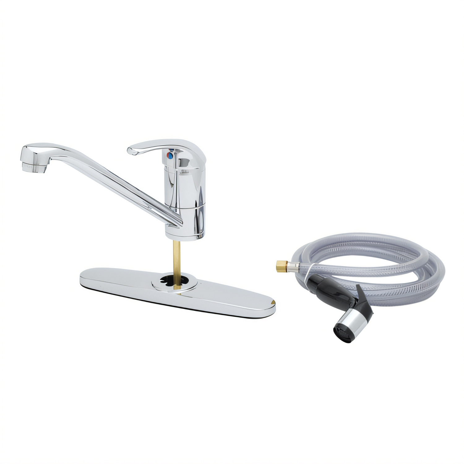 Faucet, single lever, forged brass, 9" spout, sidespray with 7 foot hose, flexible supplies, 10" deck plate, temperature limit stops, ceramic cartridge, low lead, ADA Compliant