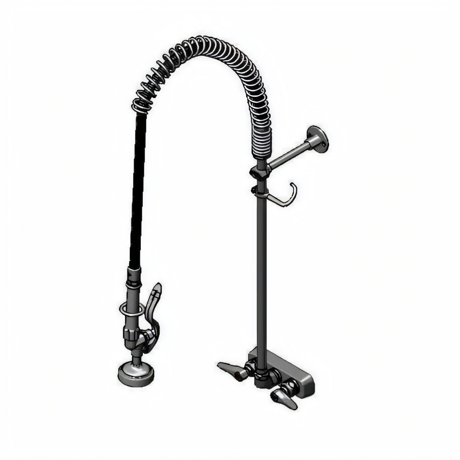 EasyInstall Workboard Pre-Rinse Unit, wall mount mixing faucet, 4" center, spring action gooseneck, 1.15 GPM spray valve (B-0107), 22" riser, 44" flexible stainless steel hose, 6" wall bracket, 1/2" NPT male inlets, lever handles, quarter-turn Eterna cartridges, low lead, 2019 DOE PRSV - Class II