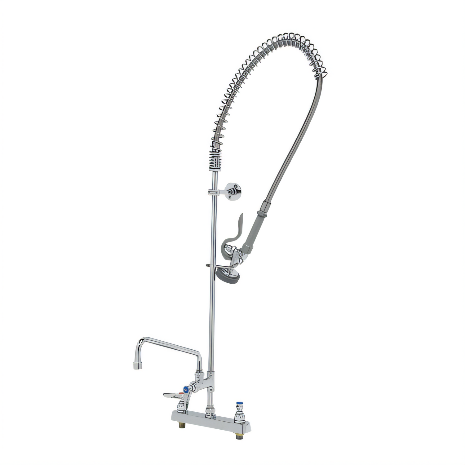 EasyInstall Workboard Pre-Rinse Unit, deck mount mixing faucet, add-on faucet with 12" swing nozzle, 8" center, spring action gooseneck, 1.15 GPM spray valve (B-0107), 24" riser, 44" flexible stainless steel hose, 6" wall bracket, 1/2" NPT male inlet, lever handles, quarter-turn Cerama cartridges, low lead, 2019 DOE PRSV - Class II