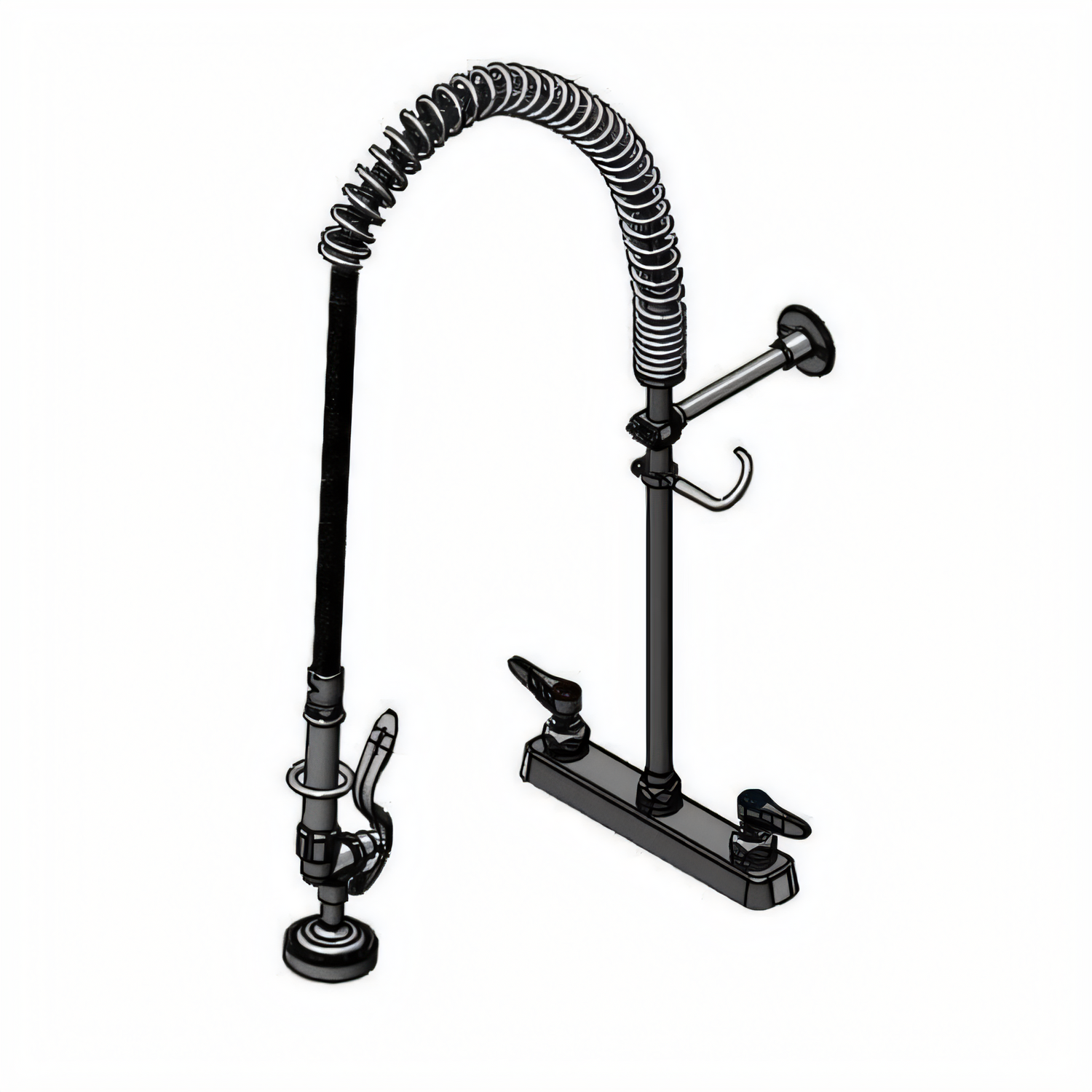 EasyInstall Pre-Rinse Unit, deck mount, 8" center, spring action gooseneck, 1.15 GPM spray valve (B-0107), 16" riser, 44" flexible stainless steel hose, 6" wall bracket, 1/2" NPT male inlets, lever handles, quarter-turn Eterna cartridges, low lead, 2019 DOE PRSV - Class II
