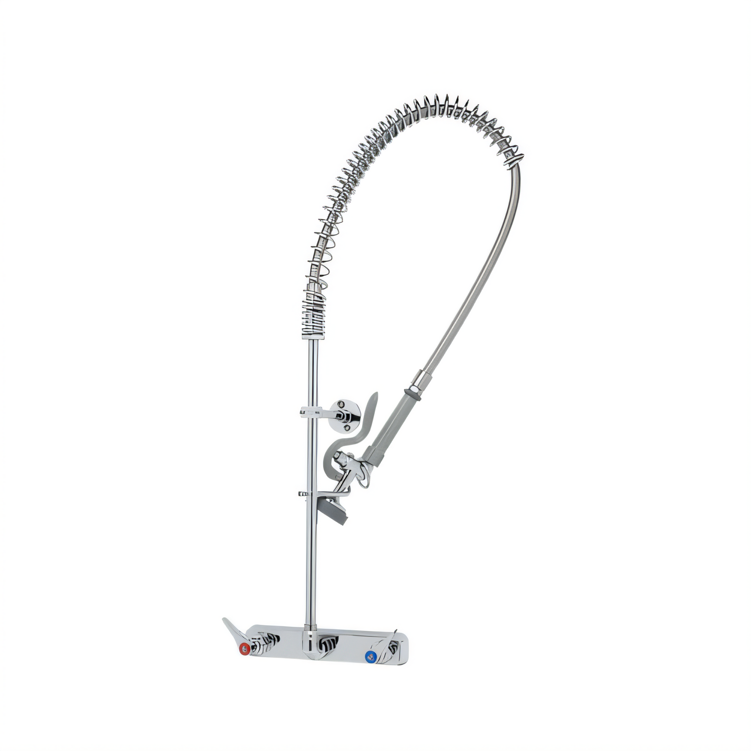 EasyInstall Workboard Pre-Rinse Unit, wall mount mixing faucet, 8" center, spring action gooseneck, 1.15 GPM spray valve (B-0107), 18" riser, 44" flexible stainless steel hose, 6" wall bracket, 1/2" NPT male inlets, lever handles, quarter-turn Eterna cartridges, low lead, 2019 DOE PRSV - Class II