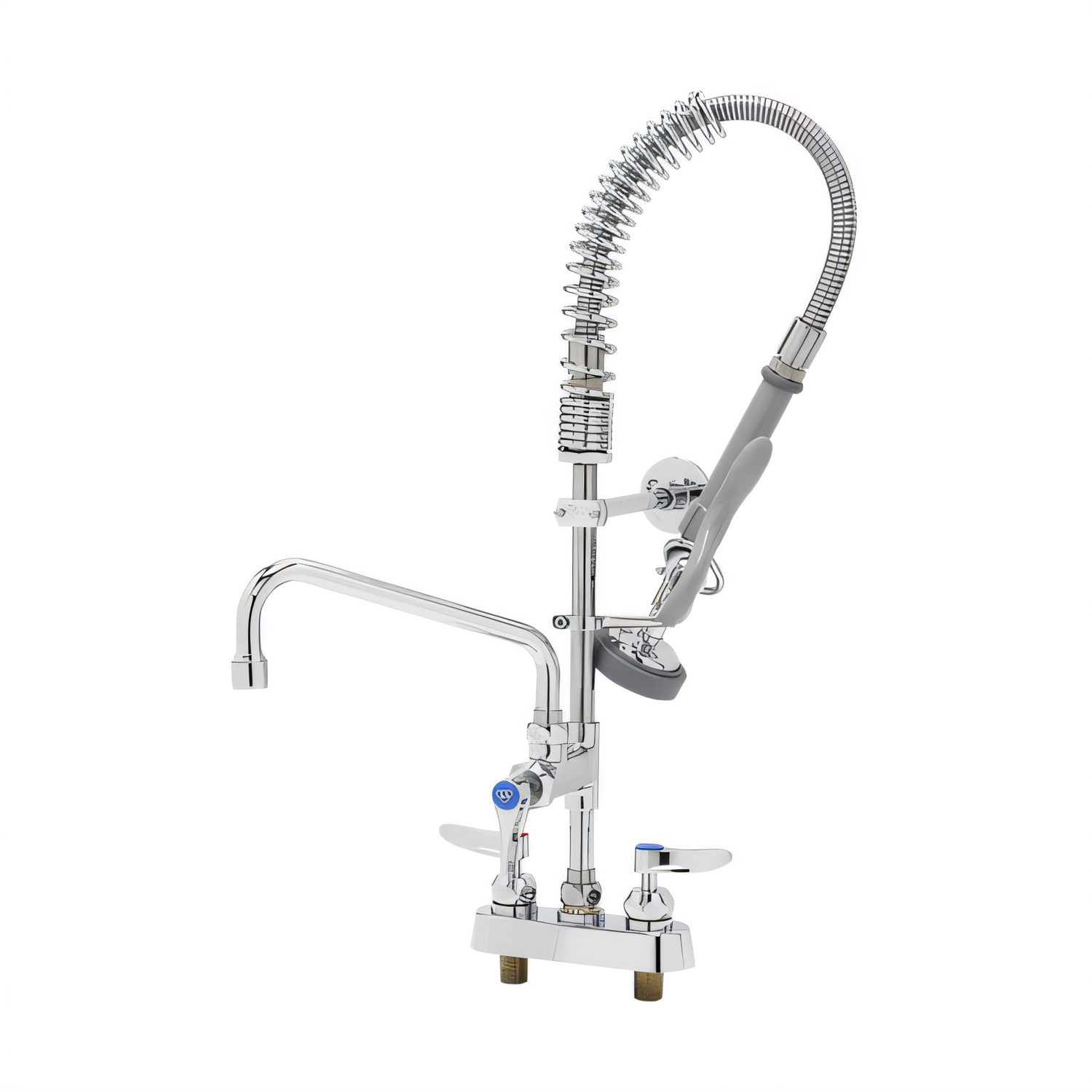 EasyInstall Mini Pre-Rinse Unit, low profile, deck mount mixing faucet with 4" adjustable centers, quarter-turn Cerama cartridges with check valves, lever handles with color coded indexes, add-on faucet with 8" swing nozzle, 8" rigid riser, 24" flexible stainless steel hose, 1.07 gpm spray valve with swivel (B-0107-J), 6" adjustable wall bracket, polished chrome plated brass body, 1/2" NPT male inlets, cCSAus