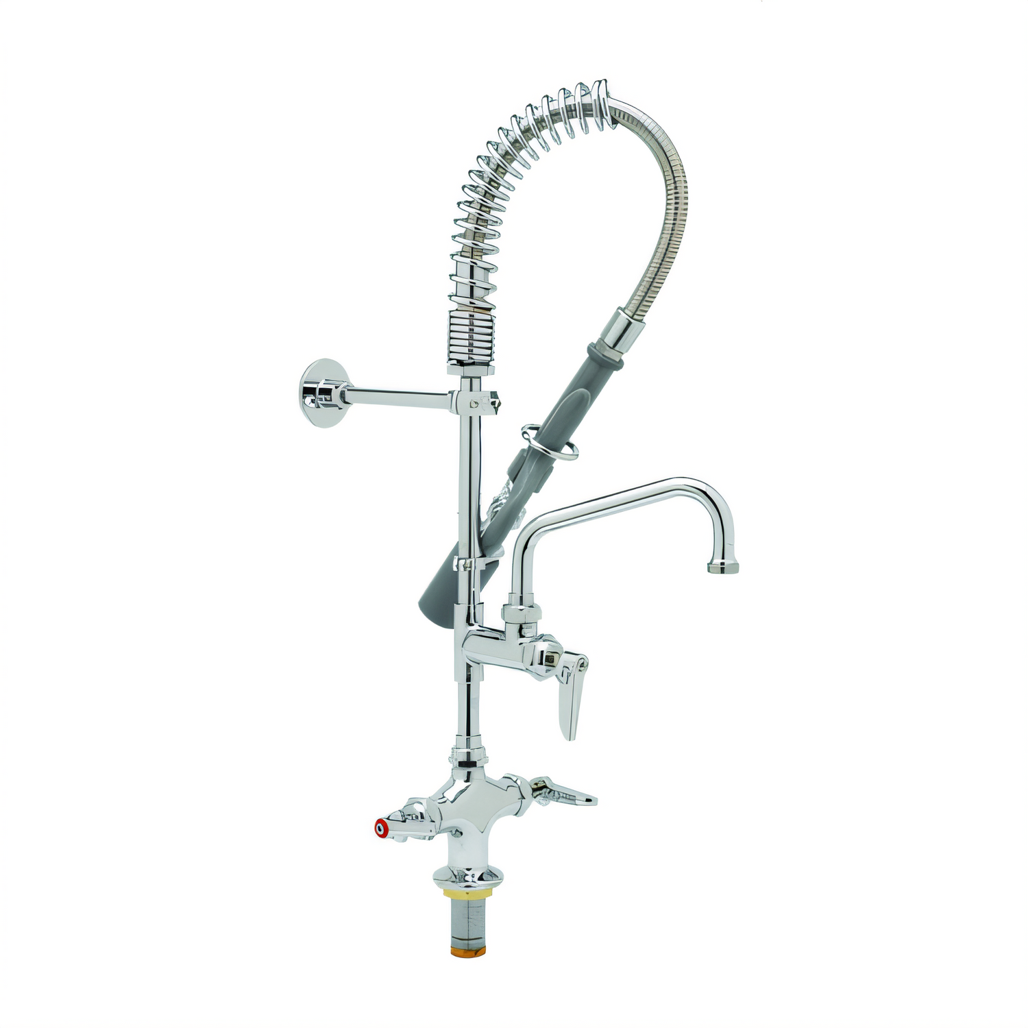 T&S Brass MPY-2DLN-06 Mini Pre-Rinse Unit – durable commercial faucet with low-flow spray valve, 6" swing nozzle and easy-turn lever handles. Compact wall-mounted design with included wall bracket delivers reliable, water-saving performance for busy kitchens and back-of-house prep. Ideal for restaurants, cafés, and foodservice environments.