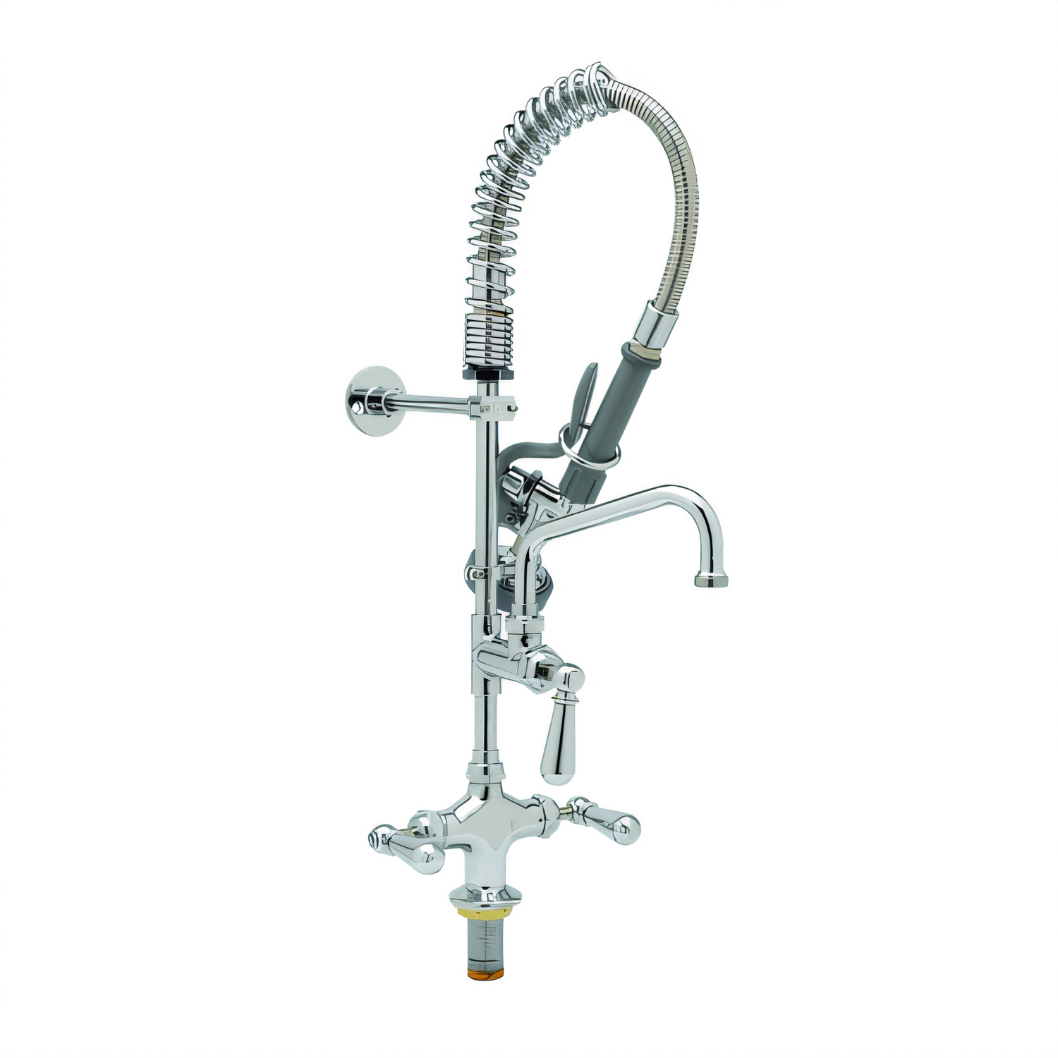 Mini Pre-Rinse Unit, single hole deck base faucet, compact spring & flex hose, spray valve, 6" wall bracket, club handles, 6" add on faucet