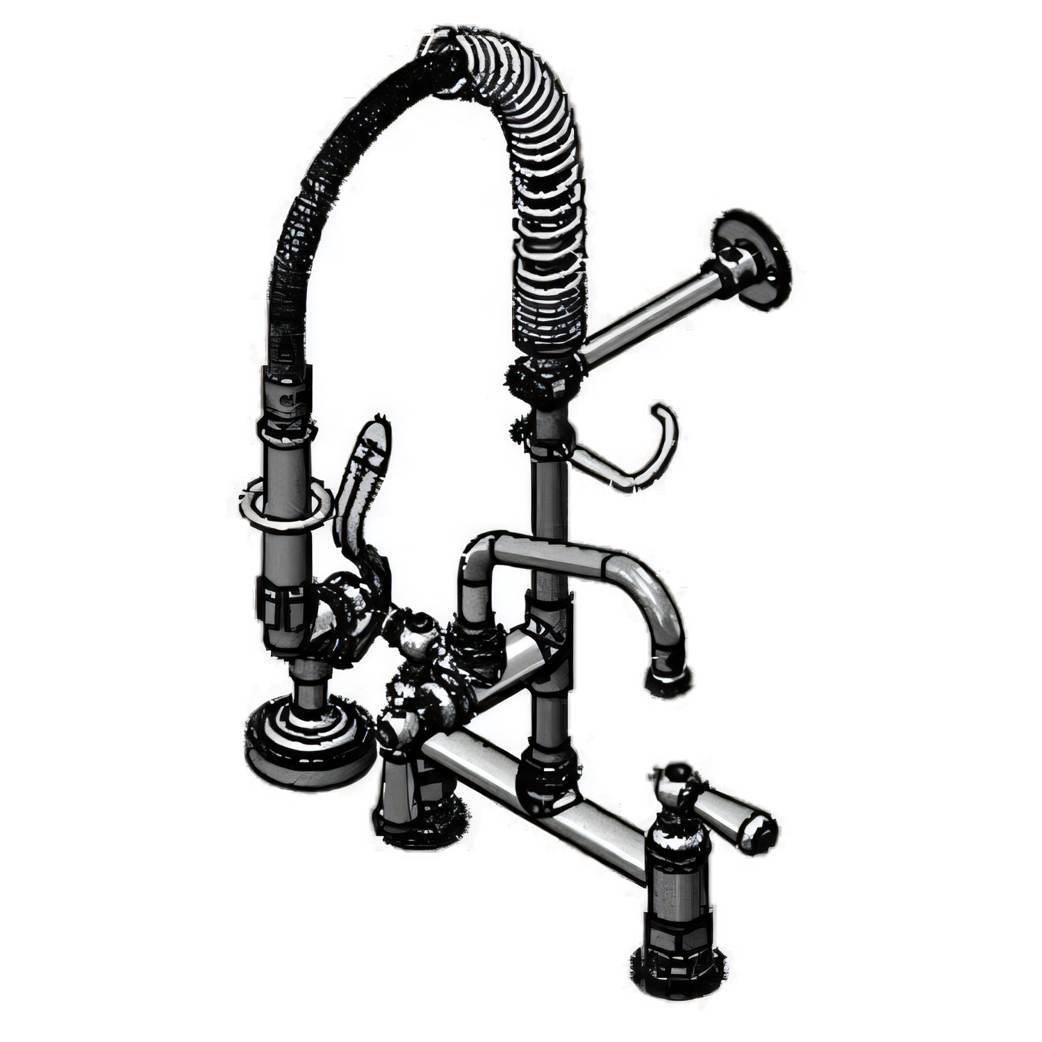 Mini Pre-Rinse Unit, 8" deck mount base faucet, compact spring & flex hose, spray valve, 6" wall bracket, club handles, 6" add on faucet