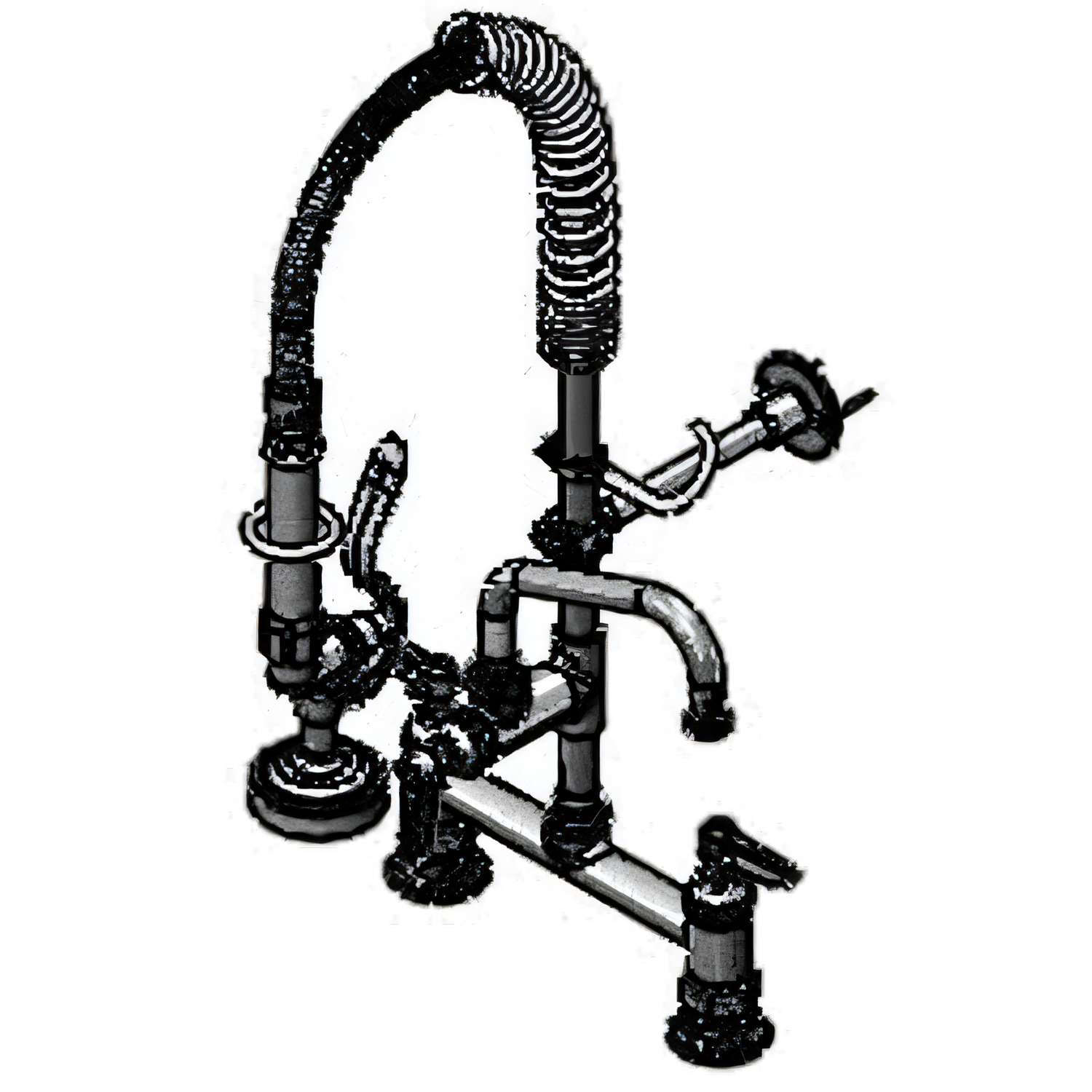 Mini Pre-Rinse Unit, 8" deck mount base faucet, compact spring & flex hose, spray valve, 6" wall bracket, lever handles, 6" add on faucet