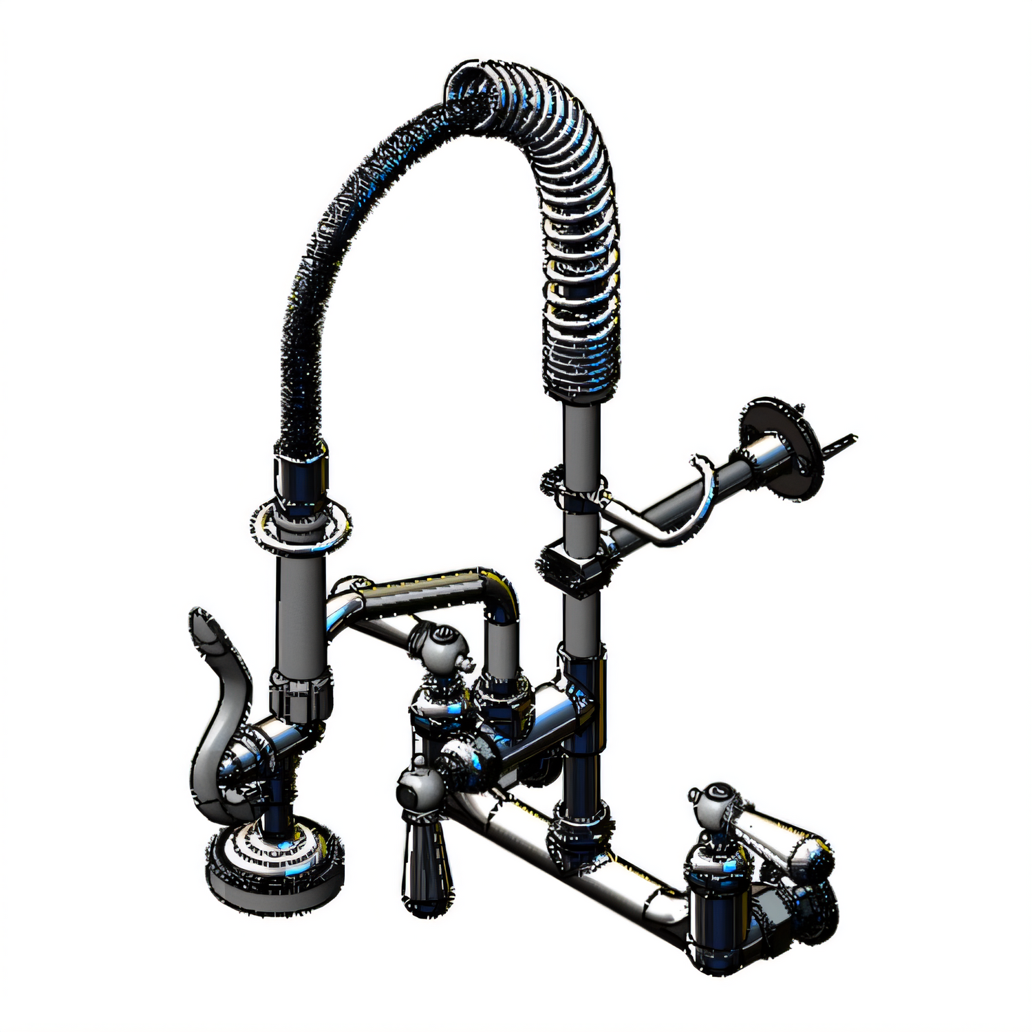 Mini Pre-Rinse Unit, 8" wall mount base faucet, compact spring & flex hose, spray valve, 6" wall bracket, club handles, 6" add on faucet
