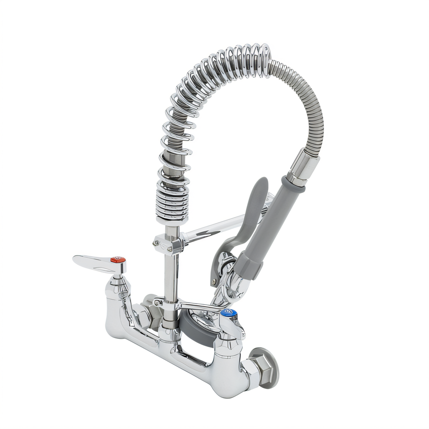 Mini Pre-Rinse Unit, 8" wall mount mixing faucet, EasyInstall 8" swing nozzle, lever handles with color coded indexes, quarter-turn Eterna cartridges with spring checks, finger hook, 6" rigid riser, 6" adjustable wall bracket, 1/2" NPT, 1.5 GPM spray valve, low lead, cCSAus