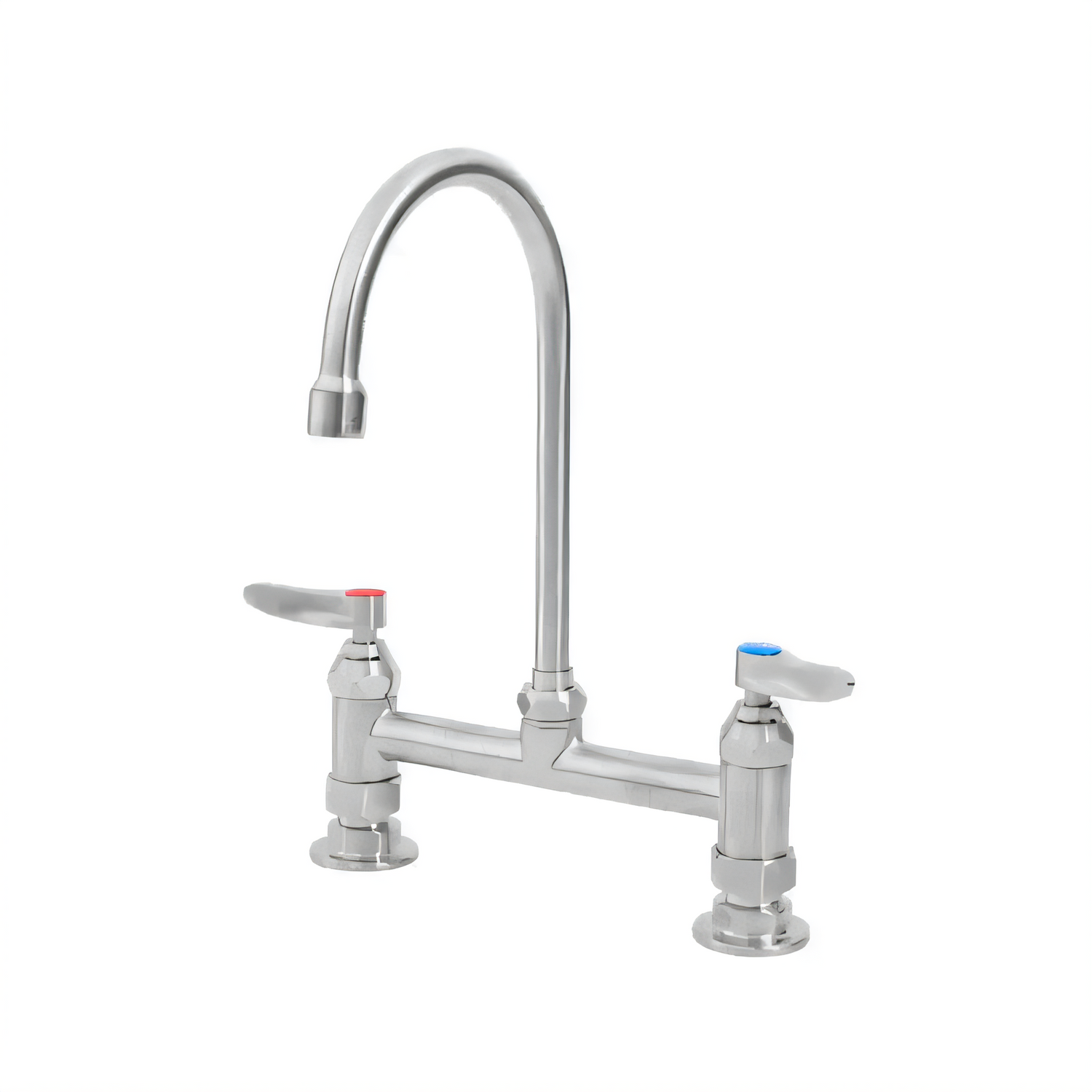 EverSteel Double Pantry Faucet, Deck Mount, 8" Cen, 8” stainless steel deck mount mixing faucet, stainless steel 5 3/4” swivel/rigid gooseneck with stream regulator outlet, stainless steel compression cartridges with spring checks, stainless steel lever handles and stainless steel 1/2” NPT female inlets. Certified to ASME A112.18.1/CSA B125.1, NSF 61-Section 9 and NSF 372. Meets ADA ANSI/ICC A117.1 requirements.
