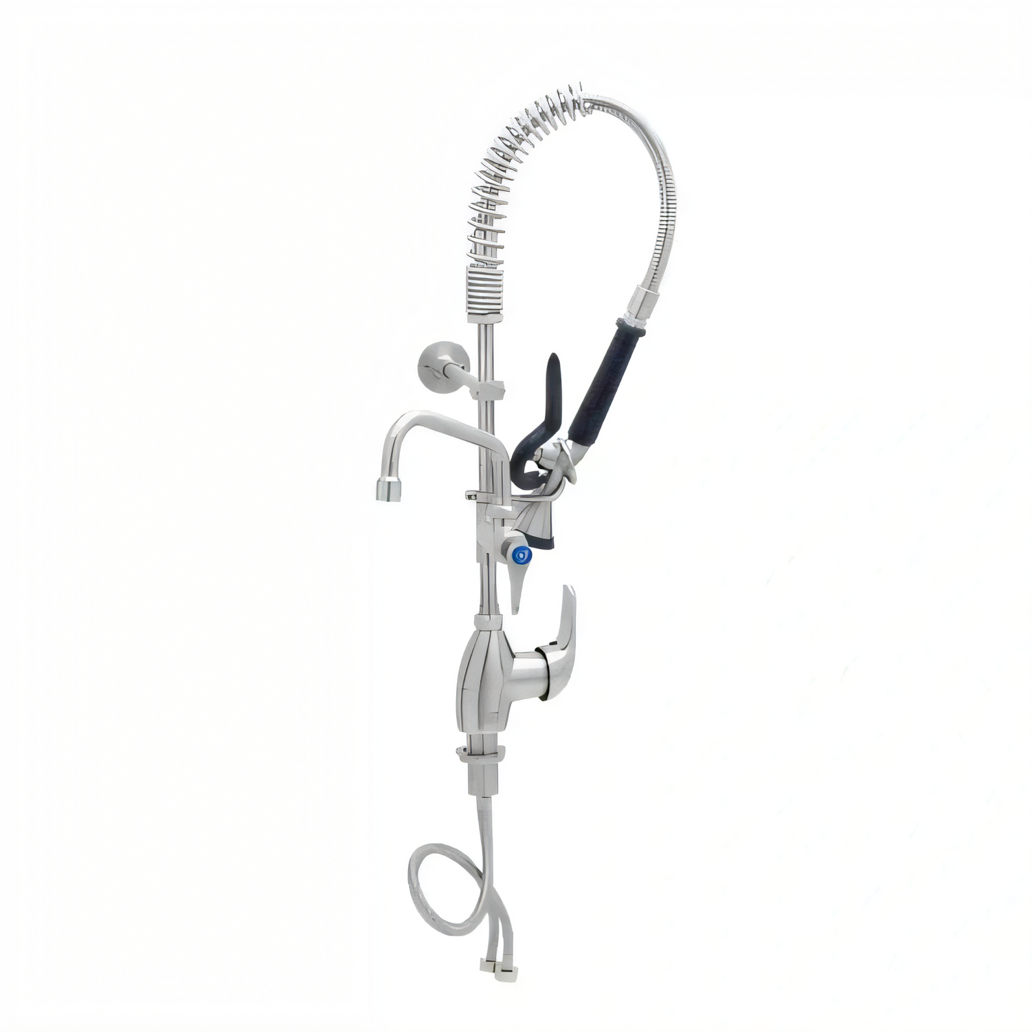 Mini Pre-Rinse Unit, single hole deck mount single lever faucet, add-on faucet, 6” swing nozzle with stream regulator outlet, 8” riser, 24” flexible hose with heat resistant handle, 1.15 GPM new style spray valve, ceramic cartridge, 18” flexible supply hoses with G1/2 female swivel connections, 6" adjustable wall bracket, spray valve holder and overhead spring, stainless steel construction, Certified to ASME A112.18.1/CSA B125.1, NSF 61-Section 9 and NSF 372. 2019 DOE PRSV - Class II compliant.