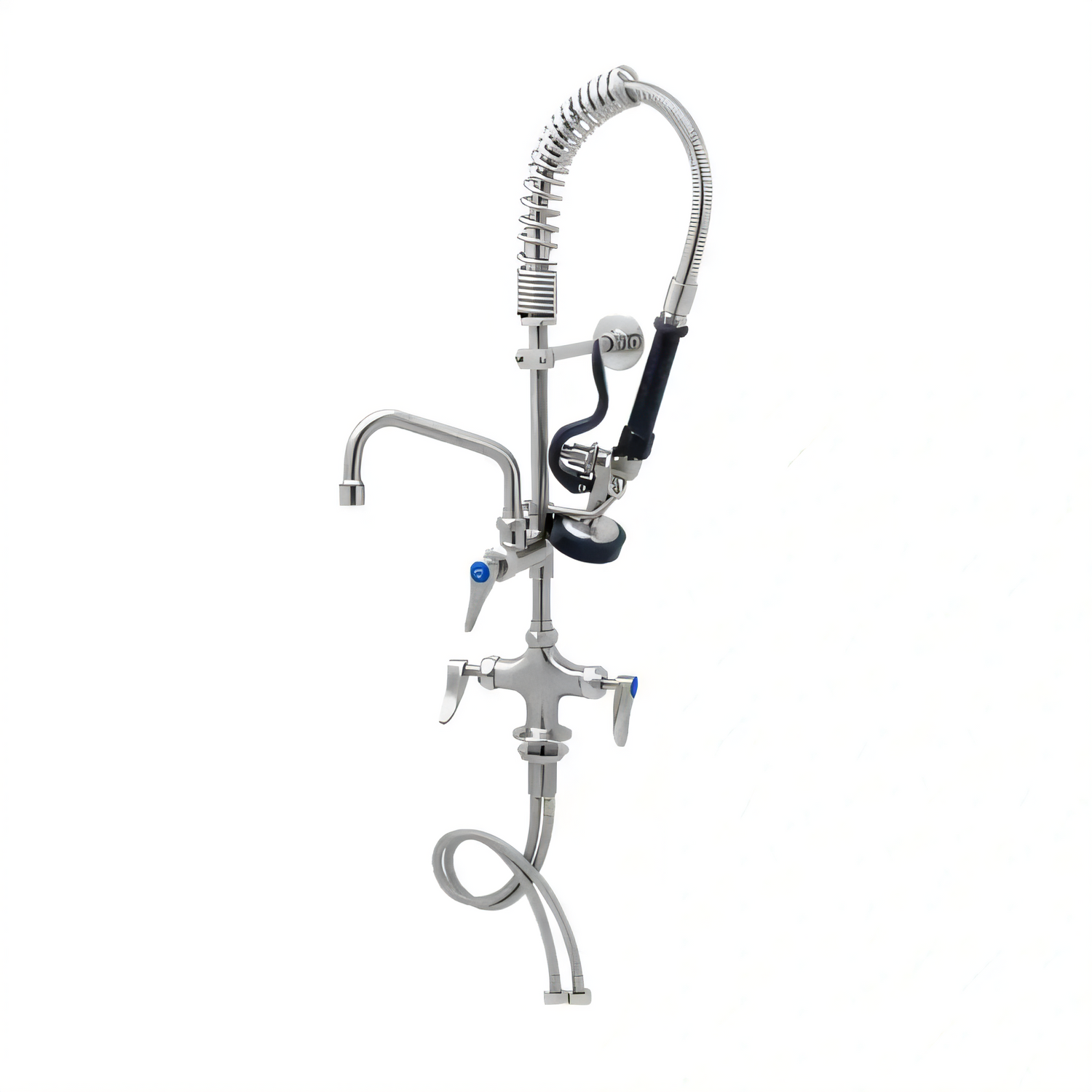 T&S Brass mini pre-rinse unit: stainless single-hole deck mix faucet, 6" swing nozzle, 24" heat-resistant hose, ADA-certified, durable commercial-grade.