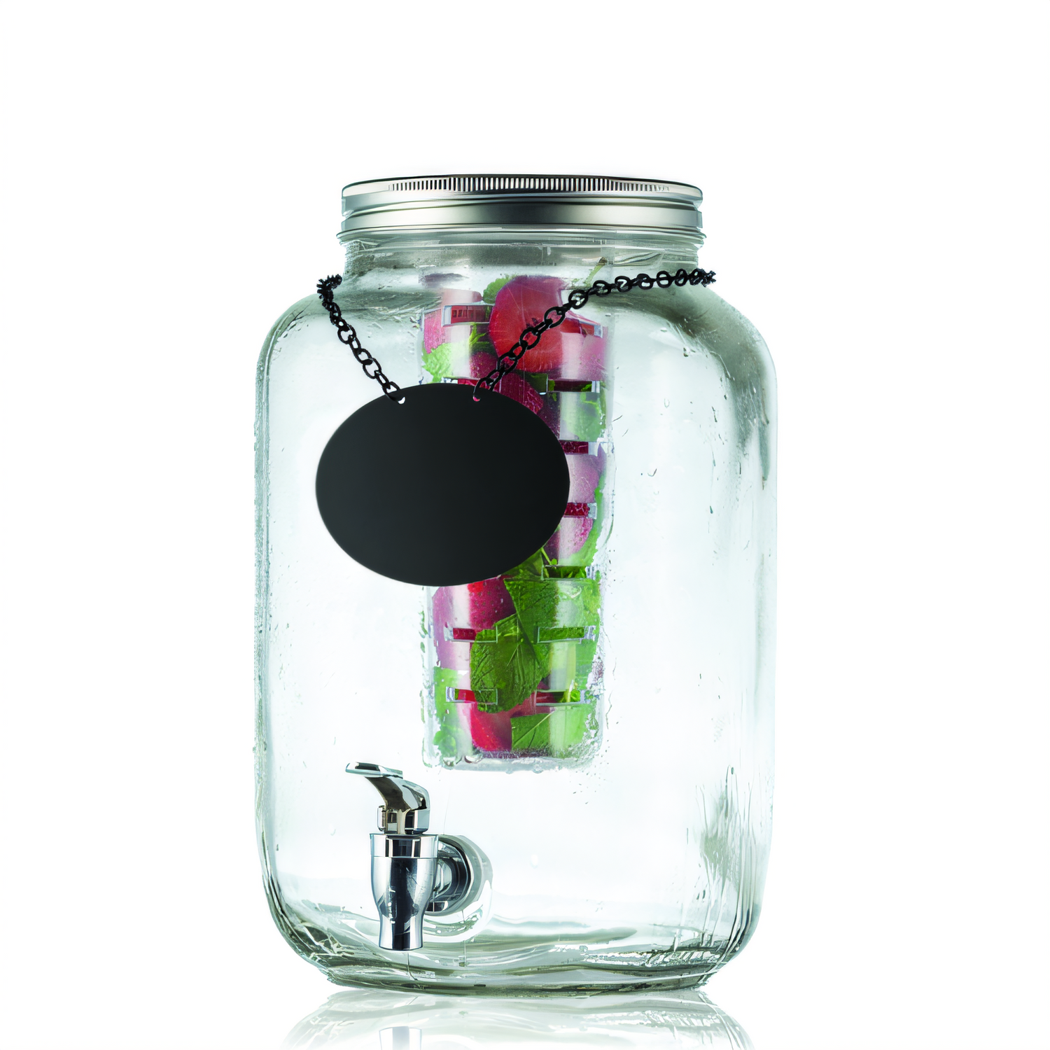 Cash & Carry Mason Jar™ Beverage Dispenser, 2 gallon, 7-3/4" x 10-1/4" x 12-1/2", hand wash only, includes: chalkboard necklace, ice core & infuser, glass (1 each minimum order)
