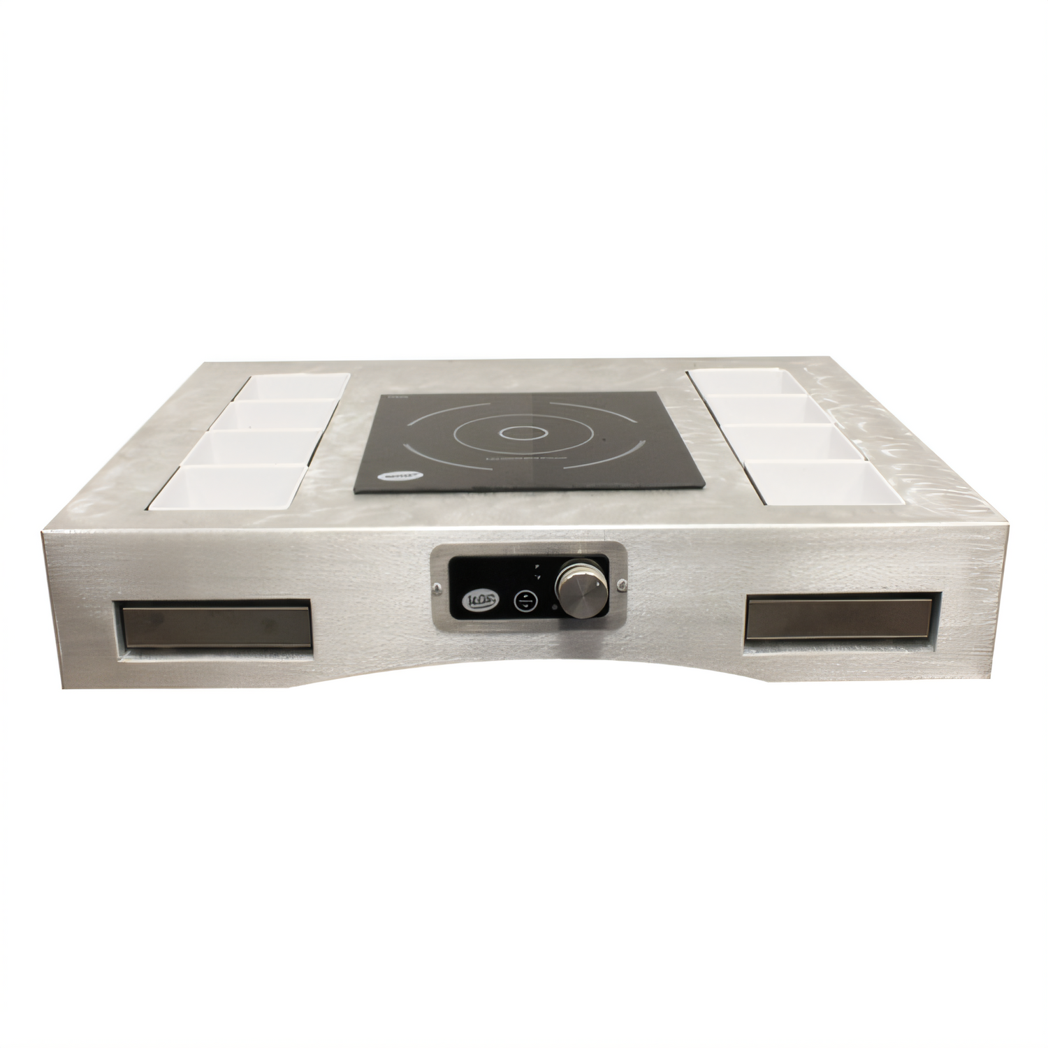Induction Countertop Station Kit, 31-3/8" x 25-1/4" x 6", includes: (1) countertop station (CW40199), (1) drop-in electric induction cooktop (CW40196), and (2) half long cooling plates (CW60103), random swirl finish, Duracoat™ coated cast aluminum, 120v/60/1-ph, 15 amp, 1800W (1 kit minimum order)