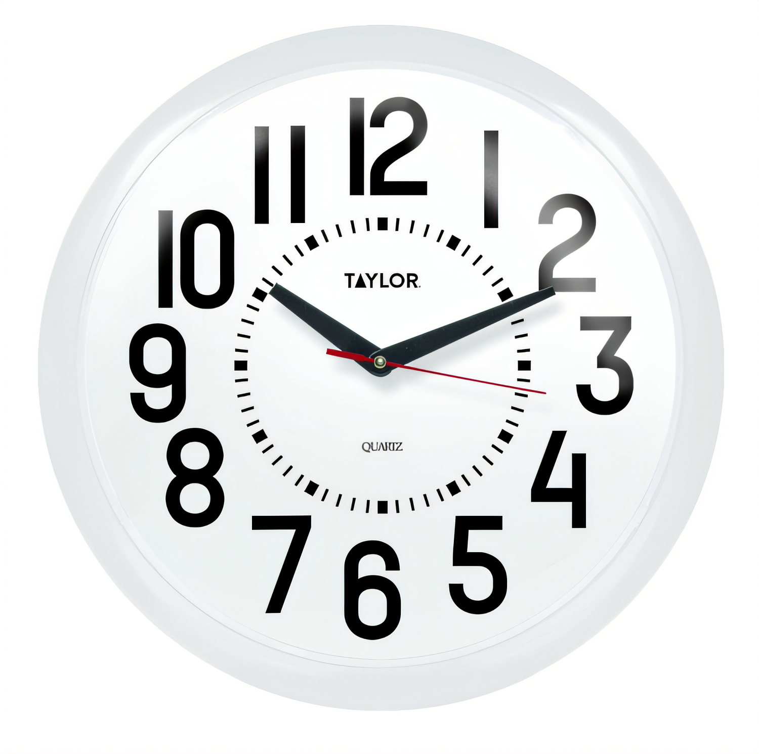 Taylor Precision 13-1/4" metal hotel alarm clock with large bold dial, weather-ready indoor/outdoor display; requires 1 AA battery.