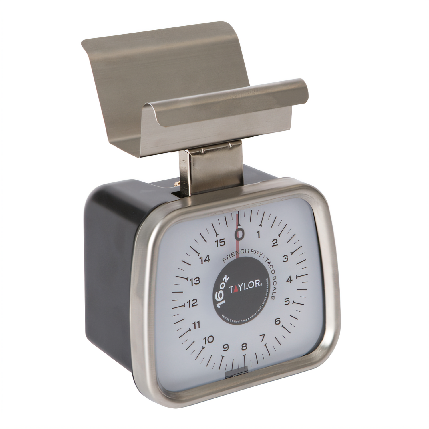 French Fry/Taco Scale, compact, analog, 16 oz. x 1/4 oz. capacity, angled dial, top loading counter model, 4-1/2" x 2-1/2" stainless steel fixed french fry/taco holder platform, bold graphics, internal stop mechanism, plastic anti-microbial housing, NSF (case pack can be broken)
