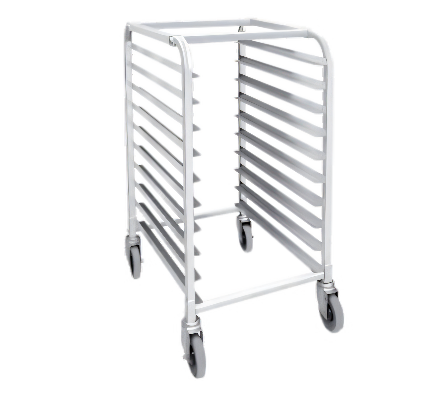 Bun Pan Rack, 20-1/4"L x 26"W x 38-1/2"H, end load, round top design, holds 10 full size or 20 half-size pans, crossbars, aluminum tubing, (4) 5" swivel casters (2-locking), NSF (assembly required)