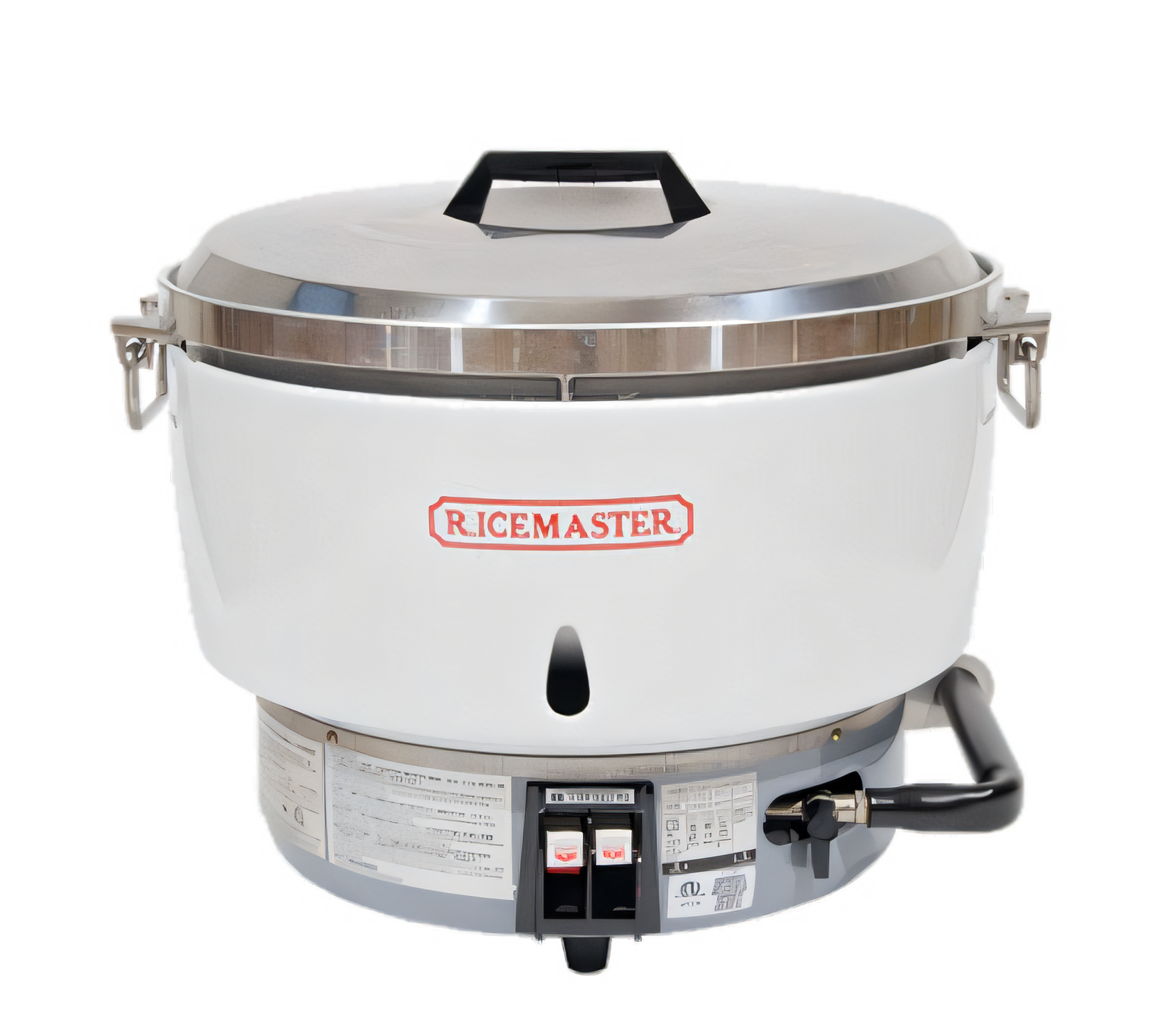 RiceMaster® Commercial Rice Cooker, natural gas, 55 cup uncooked capacity, push start button, cook and hold operation, steel drop handles, cast aluminum exterior, pressure regulator rear connection kit, 34,600 BTU, ETL, NSF