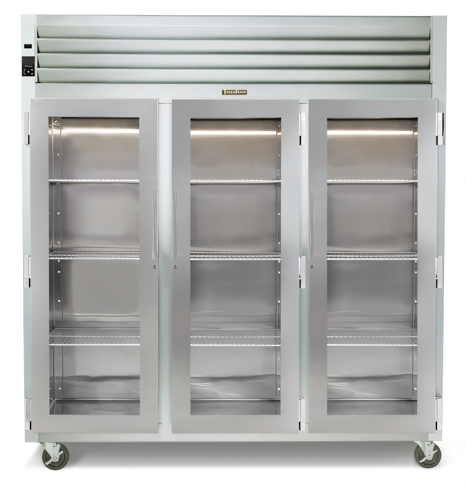 Spec-Line Heated Cabinet, Reach-in, three-section, stainless steel exterior, aluminum interior, standard depth cabinet, full-height glass doors, with EZ-Clean Gaskets, microprocessor controls, 6' adjustable stainless steel legs, cETLus, ETL-Sanitation