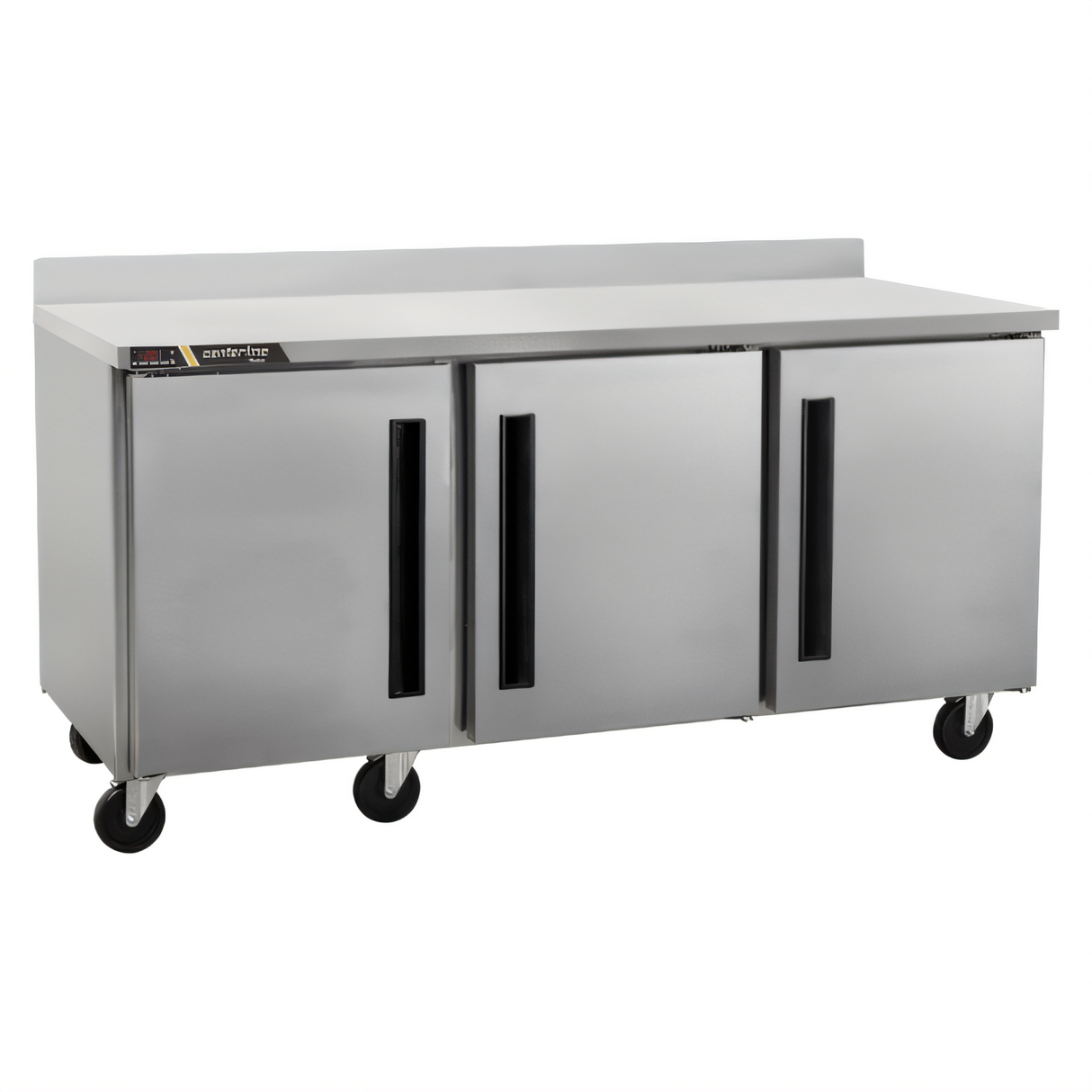 Centerline™ Compact Undercounter Freezer with Work Top, three-section, 72"W, 18.80 cu. ft. capacity, self-contained rear-mount refrigeration, (3) left hinged solid doors (field reversible), electronic control with LED display, (2) epoxy coated shelves per section, 4" backsplash, stainless steel exterior, anodized aluminum interior, (6) casters, R290 Hydrocarbon refrigerant, 1/2 HP, 115v/60/1-ph, 7.0 amps, NEMA 5-15P, cETLus, ETL-Sanitation, ENERGY STAR®