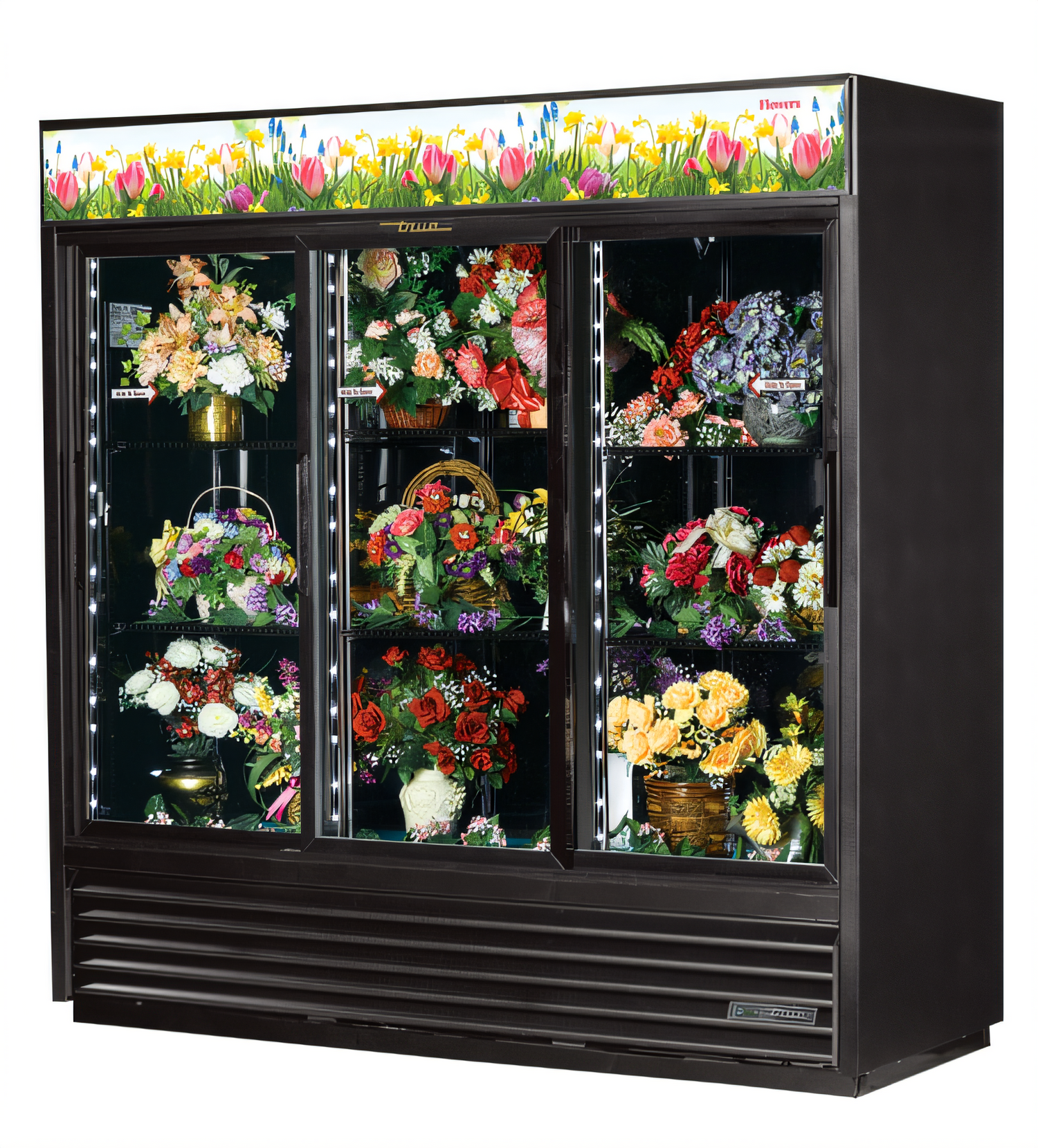 True Mfg. floral merchandiser—3-section refrigerated display with LED lighting, sliding low-E glass doors, stainless floor, US-made.