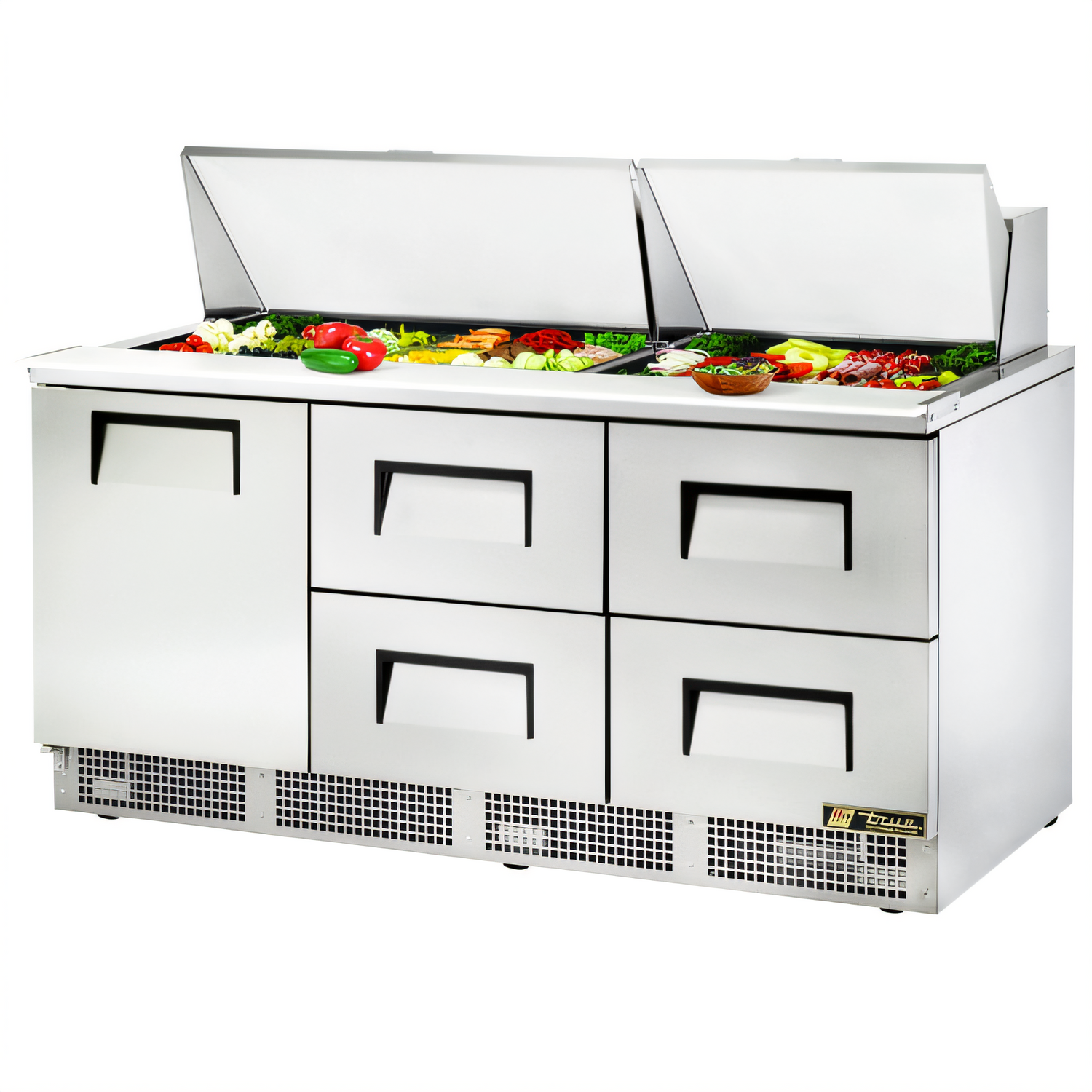 3-section | 1 Door & 4 Drawers | Includes 30 sixth-size pansBuilt in the USA for high-volume kitchens, the True TFP-72-30M-D-4 delivers rock-solid temperature control, rugged stainless construction, and the prep space you need to speed through your lunch rush. From sandwich shops to campus dining, this mega-top model keeps ingredients at a food-safe 33-41 °F while giving you a full-length 8 in. cutting board and a versatile mix of door and drawer storage.