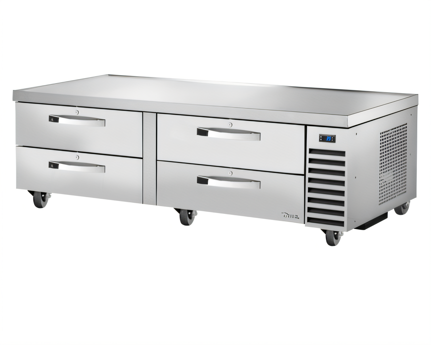 72-3/8" wide • 4 locking drawers • Spec Series® Package 3Built for the busiest commercial kitchens, the True TRCB-72-HC SPEC3 keeps your ingredients ice-cold right where you cook while supporting heavy countertop equipment. A one-piece, 18-gauge stainless top with a drip-resistant V-edge, rugged all-stainless construction, and four self-locking, pan-ready drawers make this chef base the professional’s choice for performance, durability and food safety.