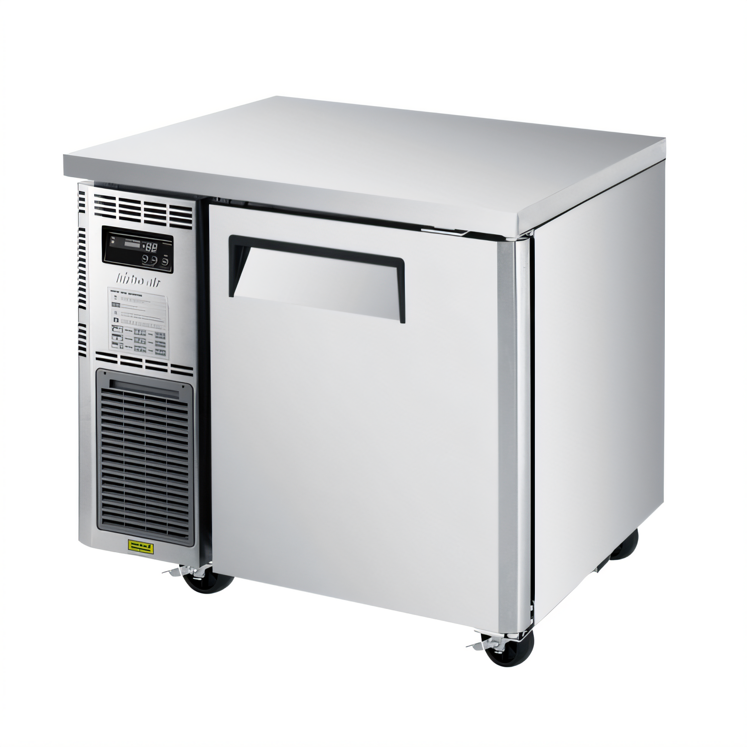 Model JUF-36S-N | 5.66 cu. ft. capacityBuilt for tight prep lines, coffee bars, and concession stands, the Turbo Air J Series undercounter freezer delivers commercial-grade cold storage in a compact 35 ⅜" footprint. Its side-mount refrigeration system draws air from the front, so the unit can slide flush against walls or equipment while still running cool and efficient.