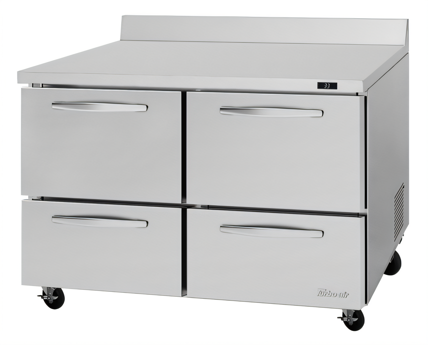 Turbo Air PRO 48" worktop refrigerator—4-drawer, 12.2 cu ft, stainless steel, self-cleaning condenser, digital controls, R290, Made in USA.