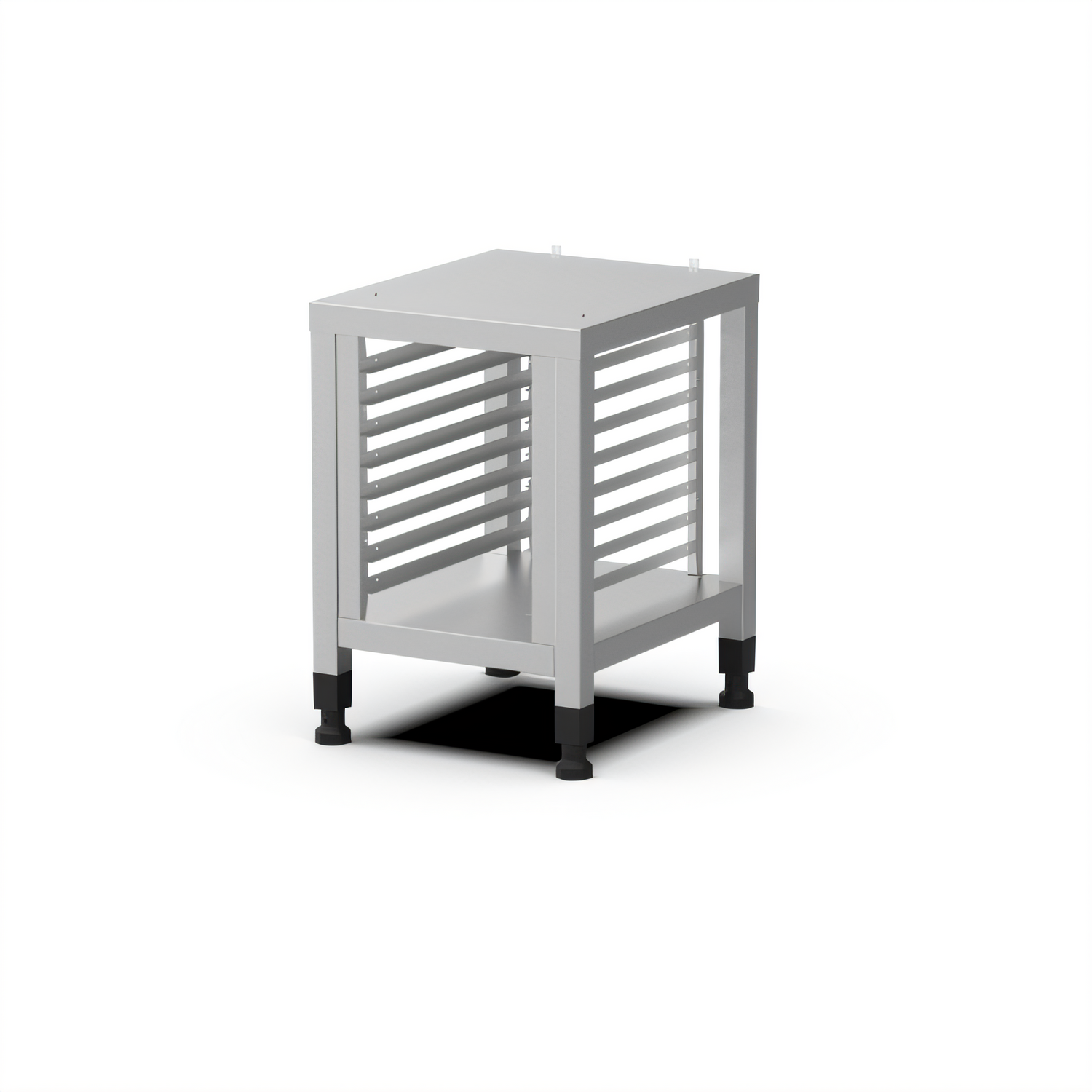 UNOX USA XWPRA-0823-H high equipment stand — sturdy stainless support for convection ovens and kitchen appliances. Compact 21-7/16" W x 25-3/8" D x 30-9/16" H profile with 2-3/16" tray pitch for efficient tray spacing and easy access. Durable, stable utility cart/stand ideal for commercial kitchens and bakeries.