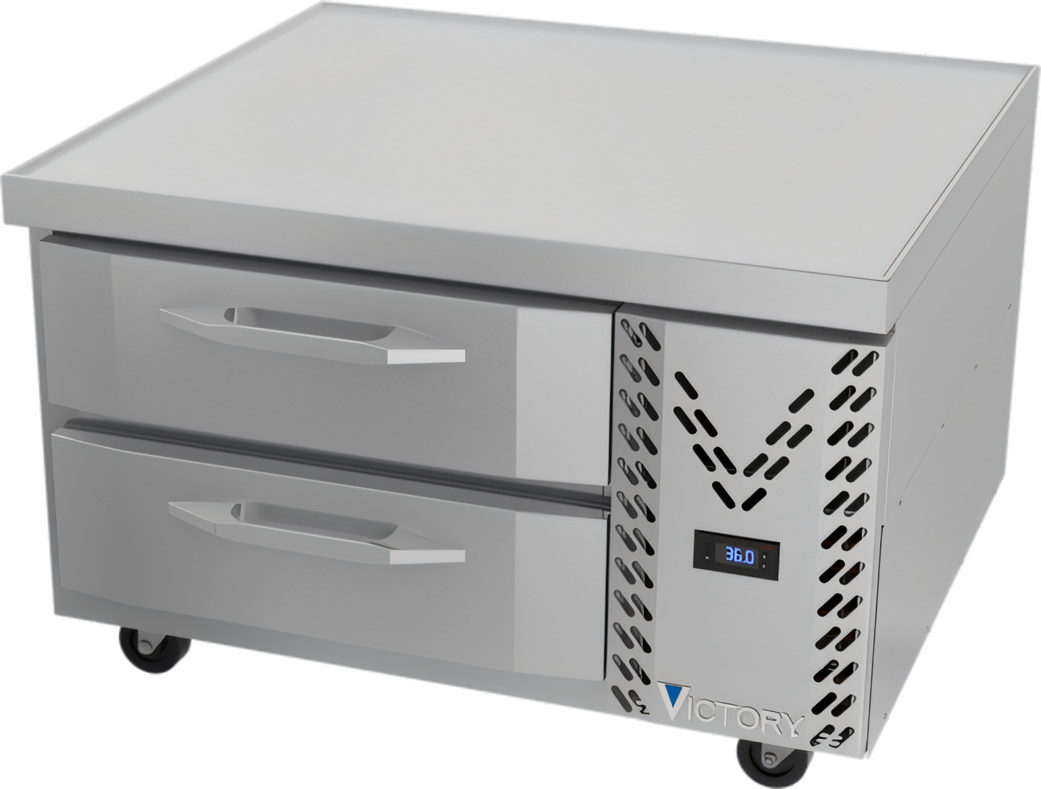Chef Base Refrigerator, Powered by V-Core™, one-section, 36"W, self-contained, 5.64 cu. ft. capacity, (2) drawers (upper drawer accommodates (2) 12" x 20" x 6" pans per drawer & lower drawer accommodates (2) 12" x 20" x 6" pans per drawer - not included), full electronic control, stainless steel exterior (galvanized back & bottom), aluminum interior, magnetic gaskets with 2 year warranty, side mounted self-contained refrigeration system, R290 hydrocarbon refrigerant, 1/6 HP, cULus, UL EPH Classified, UL-Sanitation