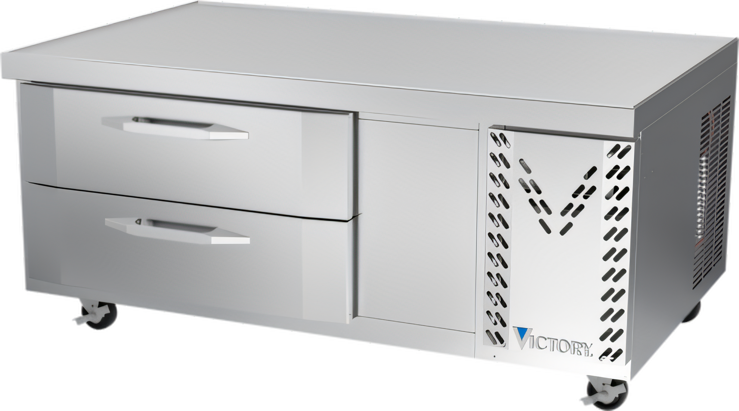 Chef Base Refrigerator, Powered by V-Core™, one-section, 52"W, self-contained, 9.58 cu. ft. capacity, (2) drawers, holds (2) pans per drawer, ( NOT included), full electronic control, stainless steel exterior (galvanized back & bottom), aluminum interior, magnetic gaskets with 2 year warranty, side mounted self-contained refrigeration system, R290 hydrocarbon refrigerant, 1/6 HP, cULus, UL EPH Classified, UL-Sanitation