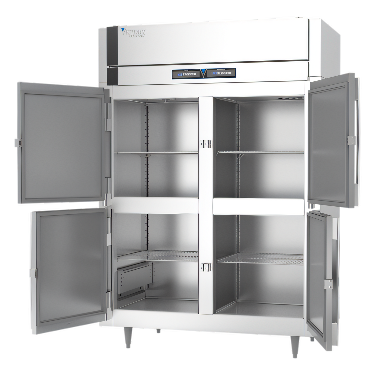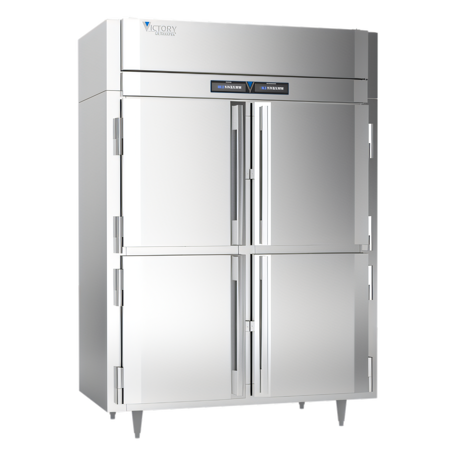 Victory Refrigeration UltraSpec™ HRS-2D-S1-EW-HD-HC is a heavy-duty dual-temp reach-in combining heated cabinets and refrigeration in one stainless steel, self-contained unit. Each two-section cabinet offers 23.8 cu. ft. per section, wide half-height hinged doors, chrome-style shelving, TOUCH POINT™ electronic controls and a top-mounted compressor with eco-friendly R-290 refrigerant. Built for commercial kitchens, this cULus and UL-Sanitation listed unit delivers reliable temperature control and energy-efficient performance.