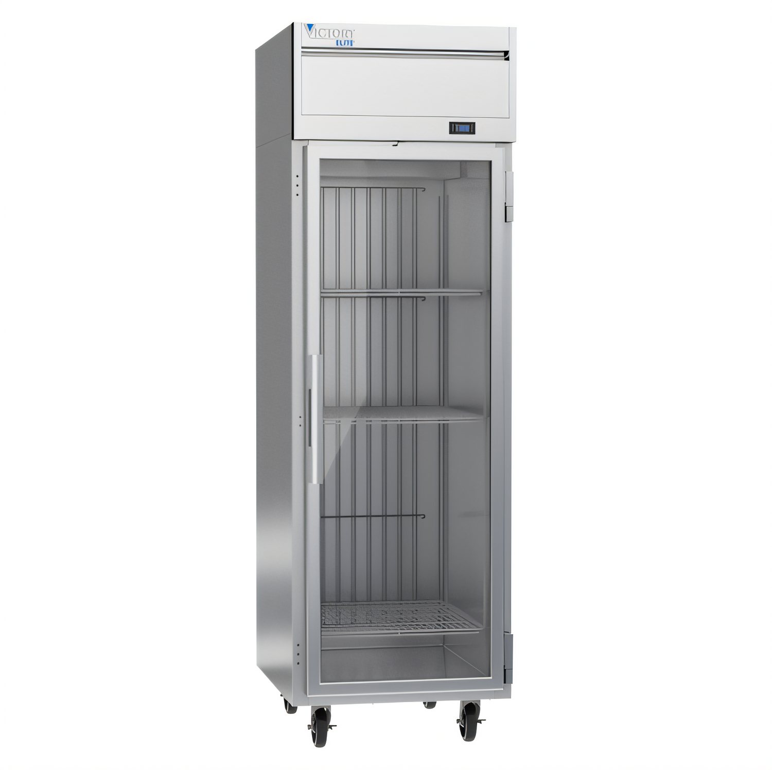 Victory Elite™ Freezer, Powered by V-Core™, reach-in, one-section, 26"W, 85" H, 21.66 cu. ft., (1) right-hand hinged glass door, (3) adjustable shelves, electronic control, LED interior lighting, digital display, automatic defrost, top mounted self-contained refrigeration, stainless steel front, gray coated sides, aluminum interior, R290 Hydrocarbon refrigerant, 3/4 HP, cULus, UL EPH Classified, UL-Sanitation