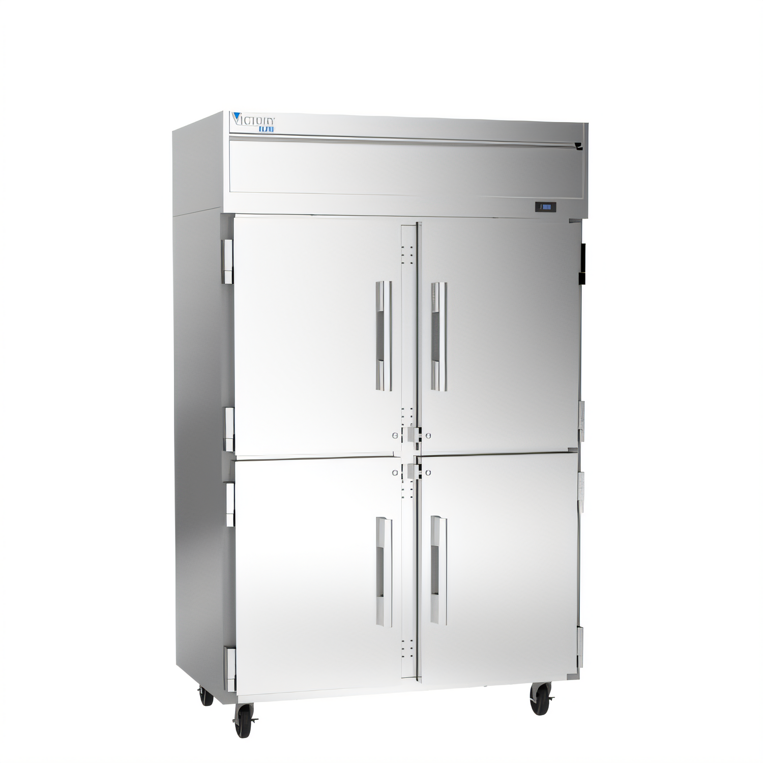 Victory Elite™ Freezer, Powered by V-Core™, reach-in, two-section, 52"W, 84-7/8" H, 45.2 cu. ft., (2) right-hand hinged half height solid doors, (2) left-hand hinged half height solid doors, door locks, (6) adjustable shelves, electronic control, LED interior lighting, digital display, automatic defrost, top mounted self-contained refrigeration, stainless steel front, gray coated sides, aluminum interior, R290 Hydrocarbon refrigerant, 3/4 HP, cULus, UL EPH Classified, UL-Sanitation