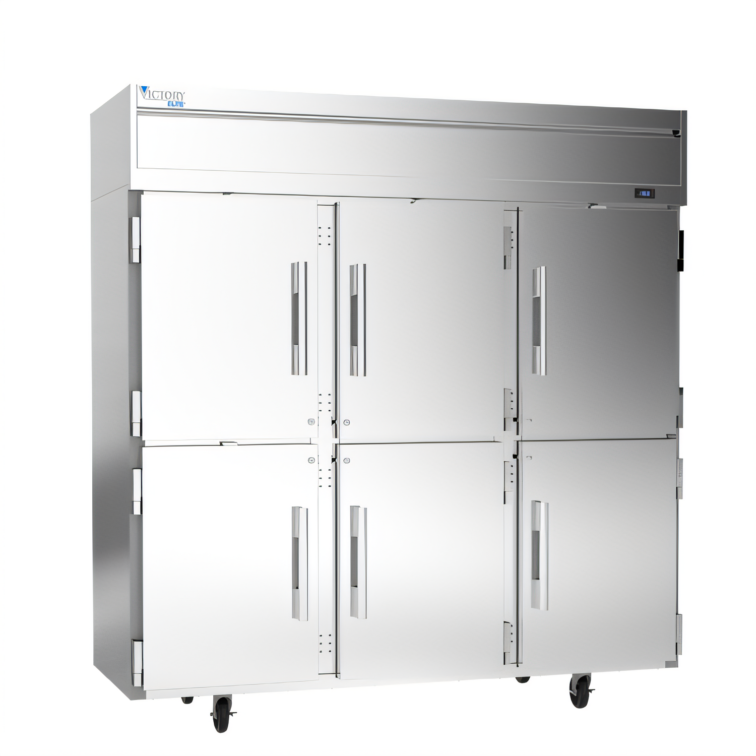 Victory Elite™ Freezer, Powered by V-Core™, reach-in, three-section, 78"W, 84-7/8"H, 69.1 cu. ft., (2) center half height solid doors (right-hand hinged), (2) right half height solid doors (right-hand hinged), (2) left half height solid doors (left-hand hinged), door locks, (9) adjustable shelves, electronic control, LED interior lighting, digital display, automatic defrost, top mounted self-contained refrigeration, stainless steel front, gray coated sides, aluminum interior, R290 Hydrocarbon refrigerant, (2) 3/4 HP, cULus, UL EPH Classified, UL-Sanitation