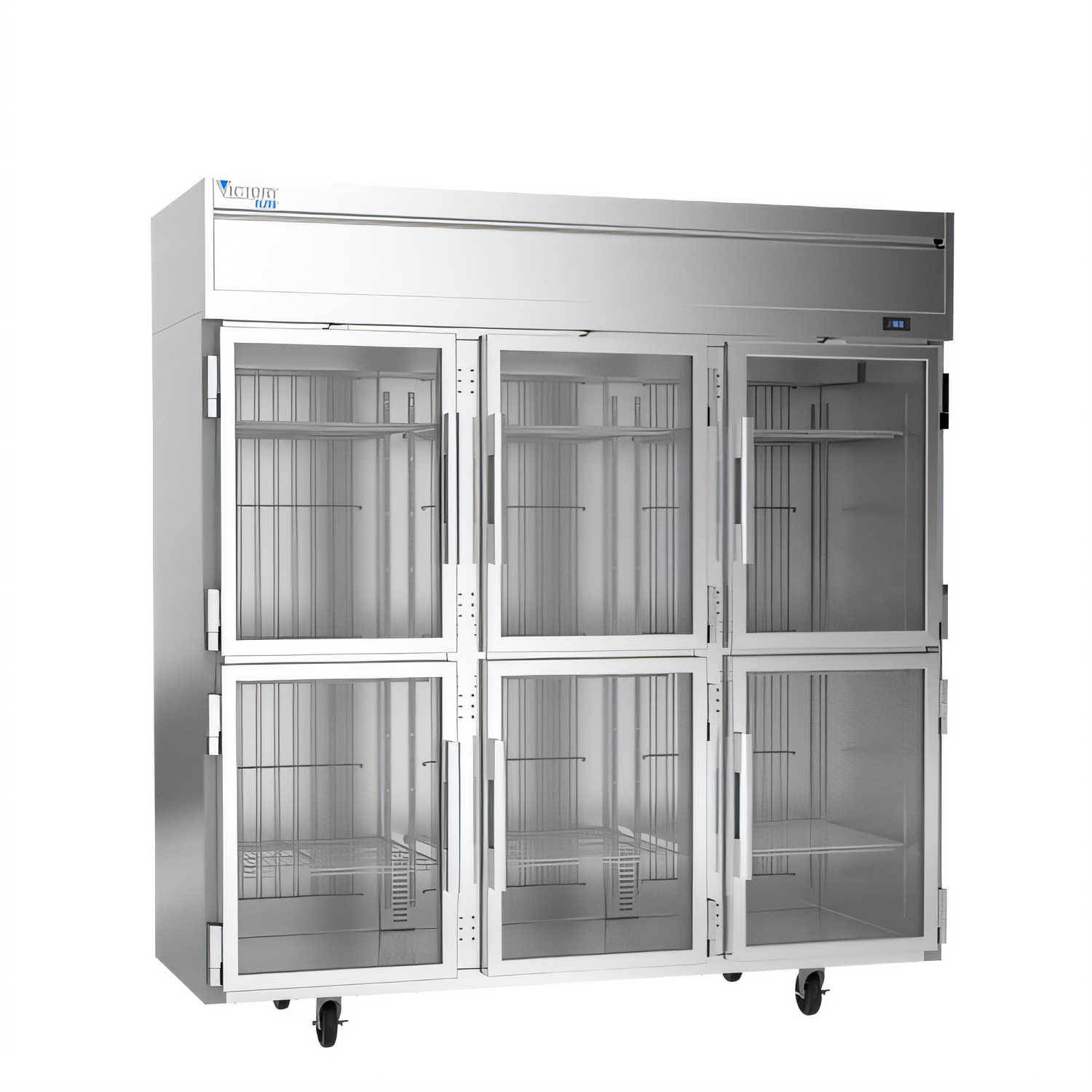 Victory Elite™ Freezer, Powered by V-Core™, reach-in, three-section, 78"W, 84-7/8"H, 69.1 cu. ft., (2) center half height glass doors (right-hand hinged), (2) right half height glass doors (right-hand hinged), (2) left half height glass doors (left-hand hinged), (9) adjustable shelves, electronic control, LED interior lighting, digital display, automatic defrost, top mounted self-contained refrigeration, stainless steel front, gray coated sides, aluminum interior, R290 Hydrocarbon refrigerant, (2) 3/4 HP, cULus, UL EPH Classified, UL-Sanitation