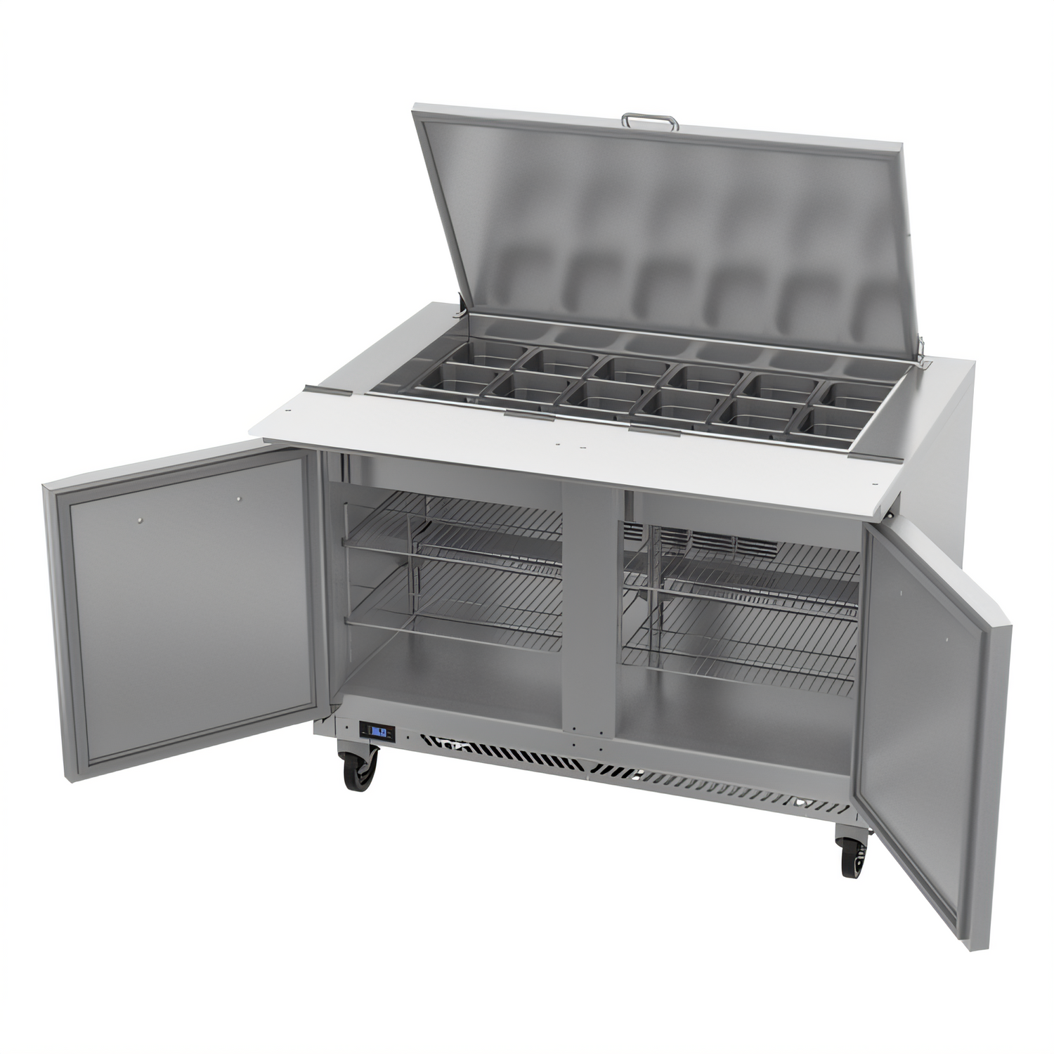 UltraSpec™ Series Big Top Sandwich Prep Table, Powered by V-Core™, two-section, 48"W, self-contained, 13.0 cubic feet capacity, (2) self-closing doors, (4) epoxy coated shelves, stainless top with opening for (18) 1/6 size pans, 10" cutting board constructed of white polyethylene plastic, locking divider bars, hinged, insulated flat lift-up lid, full electronic control, stainless steel door, front, & sides, aluminum interior, Santoprene gaskets with 2 year warranty, rear mount refrigeration system, R290 Hydrocarbon refrigerant, 1/6 HP, cULus, UL EPH Classified, UL-Sanitation
