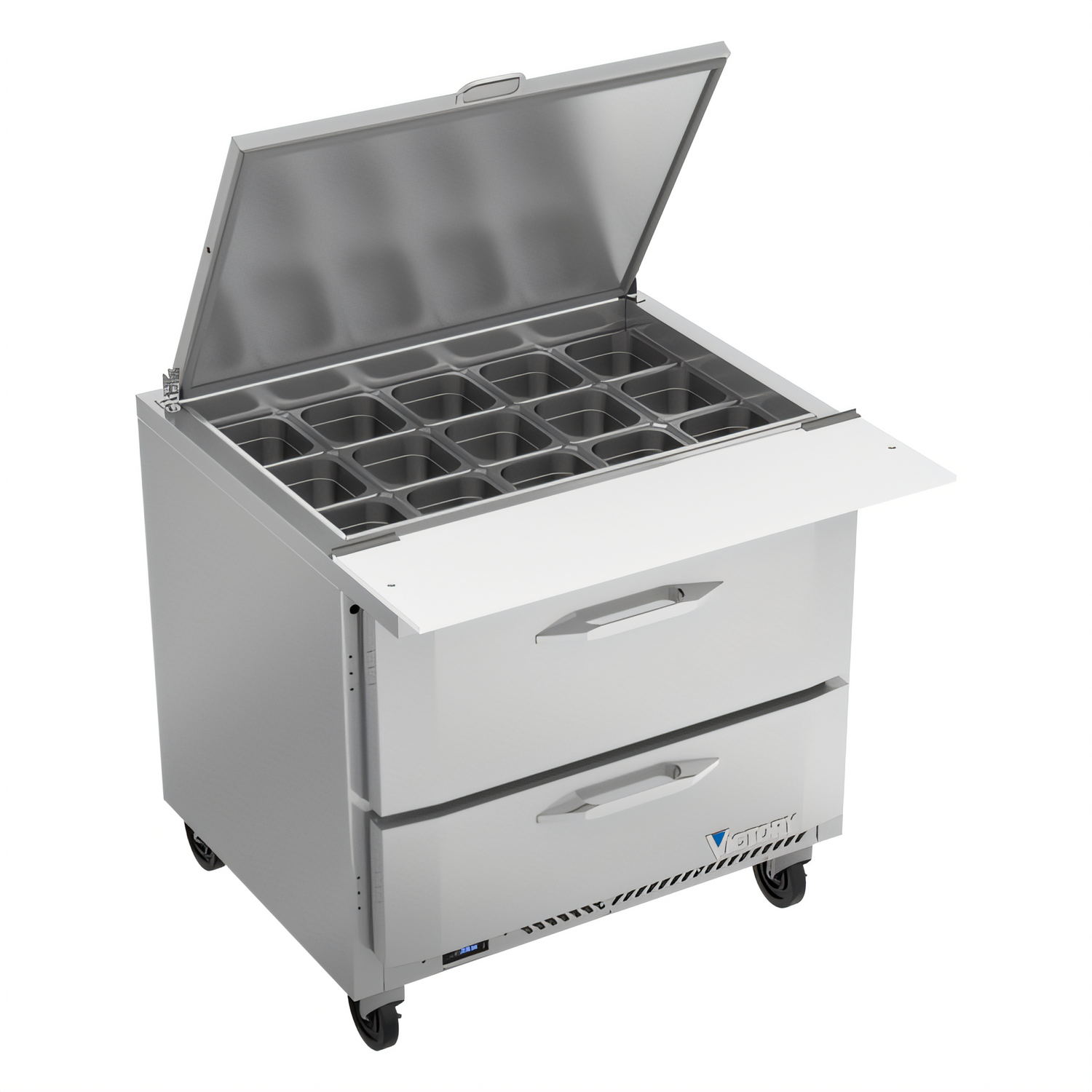 UltraSpec™ Series Big Top Sandwich Prep Table, Powered by V-Core™, one-section, 36"W, self-contained, 10.0 cubic feet capacity, (2) drawers (upper drawer accommodates (2) 4" deep pans & lower drawer accommodates (2) 6" deep pans - not included), stainless top with opening for (15) 1/6 size pans, 10" cutting board constructed of white polyethylene plastic, locking divider bars, hinged, insulated flat lift-up lid, full electronic control, stainless steel front, & sides, aluminum interior, Santoprene gaskets with 2 year warranty, rear mount refrigeration system, R290 Hydrocarbon refrigerant, 1/6 HP, cULus, UL EPH Classified, UL-Sanitation