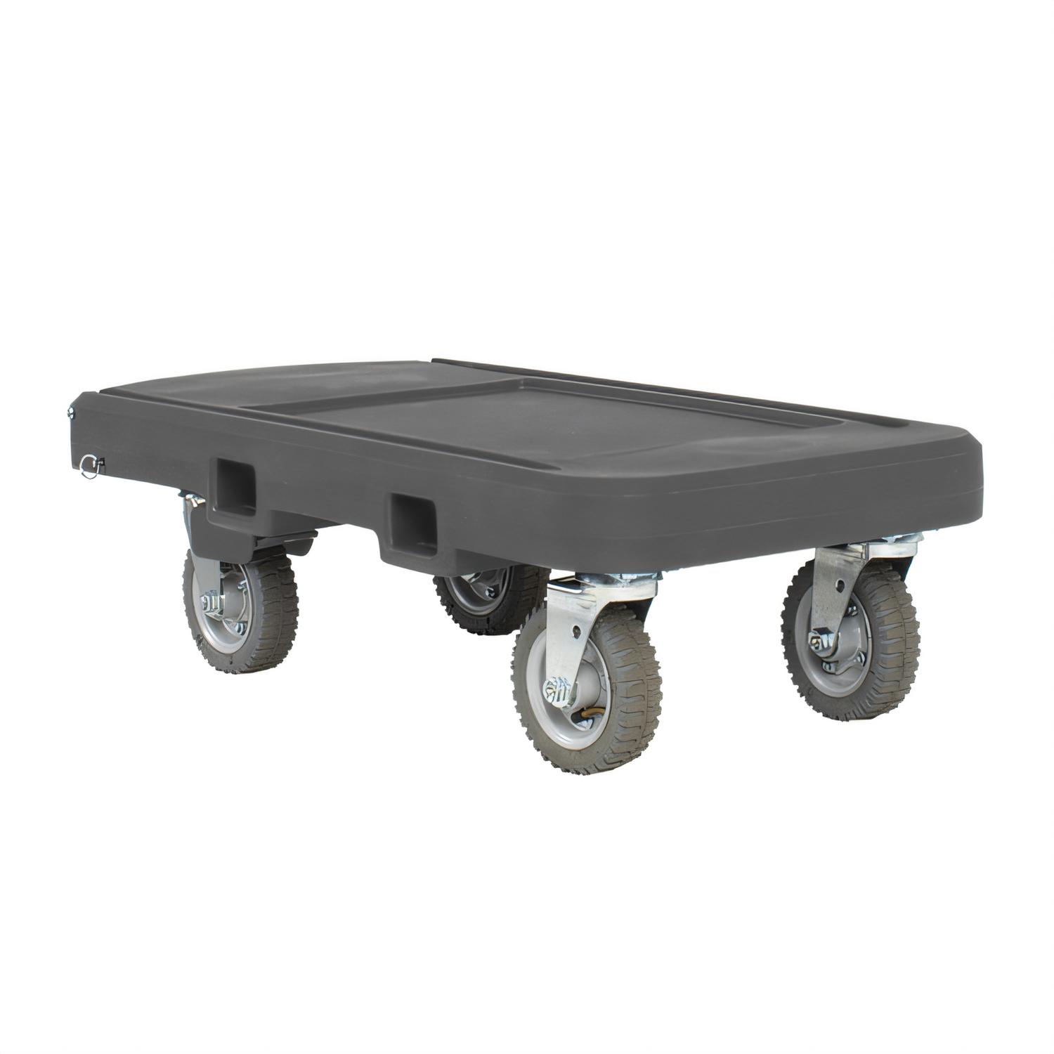 Utility Dolly, flatbed, recessed top surface, with 1-1/2" black heavyweight polypropylene webbed straps, storage pocket, transports up to 350 pounds, heavy-duty plastic, (4) 6" pneumatic wheels ((2) fixed wheels in front and (2) swivel wheels with brake in back), dark gray, Made in USA (Refer to vollrathfoodservice.com for full warranty policy)