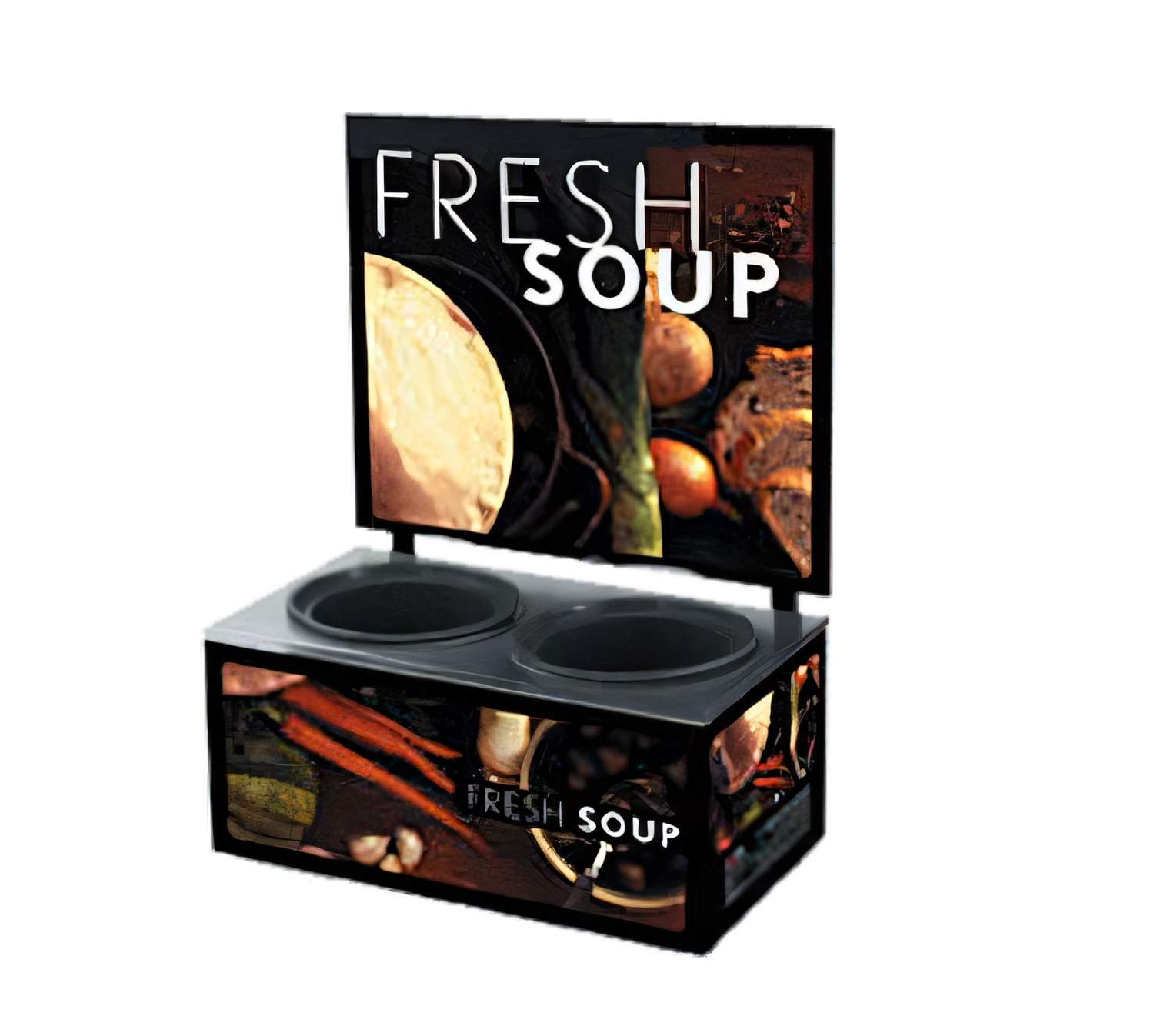 Cayenne® Twin Well Soup Merchandiser with Menu Board & Tuscan Graphics, BASE with MENU BOARD, accommodates (2) 7-1/4 quart, insets, self-insulating wells, cast alum element with non-stick coating, 120v/60/1-ph, 700 watts per well, 11.7 amps, NEMA 5-15P, 24-9/16"L x 14-9/16"W x 33-1/8"H, UL, NSF, Made in USA (Refer to vollrathfoodservice.com for full warranty policy)