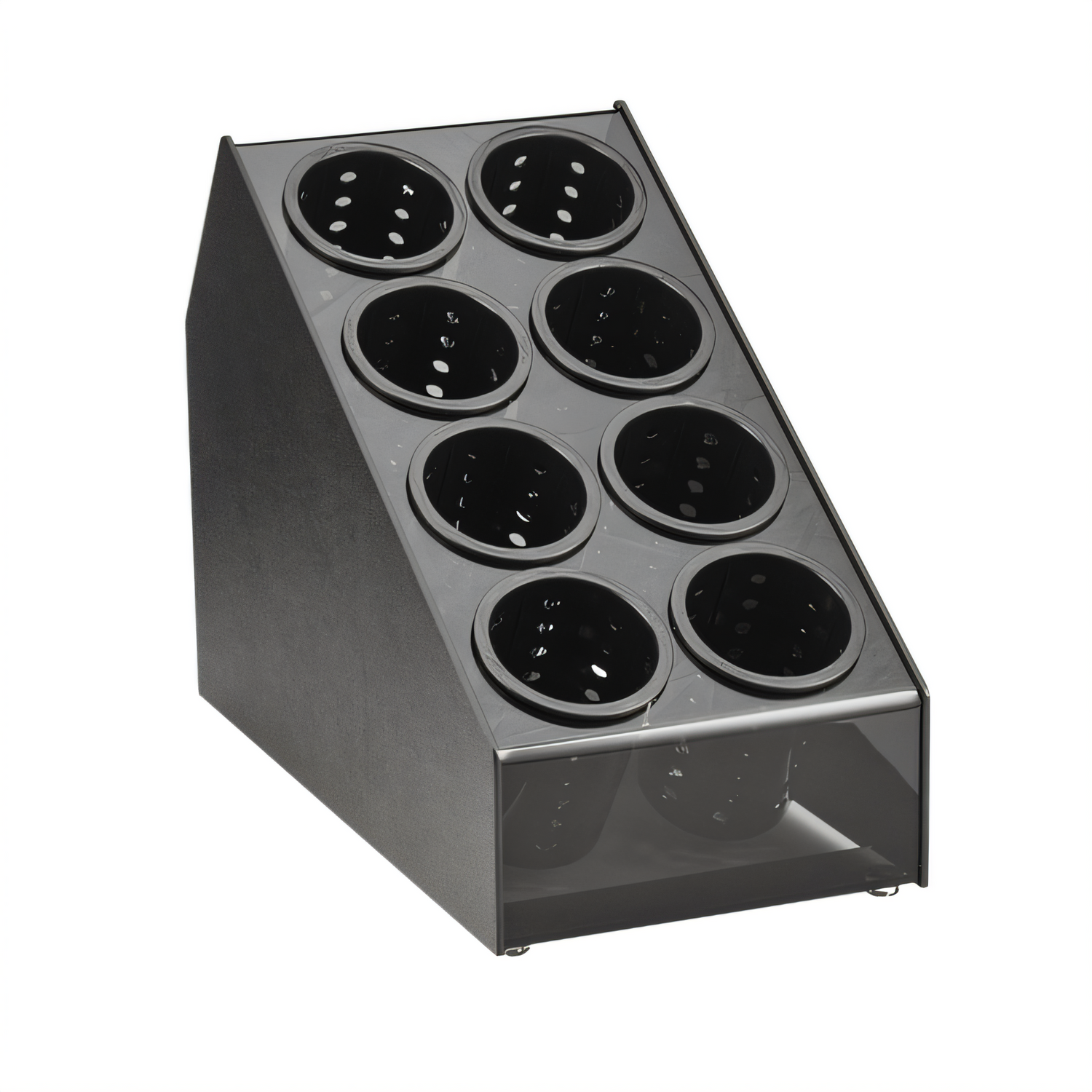 Flatware Holder, countertop, 10-1/8"W x 19-3/4"D x 15"H, (8) compartments (4 high x 2 wide), includes (8) 52633 flatware cylinders, black ABS & smoked acrylic construction (Refer to vollrathfoodservice.com for full warranty policy)